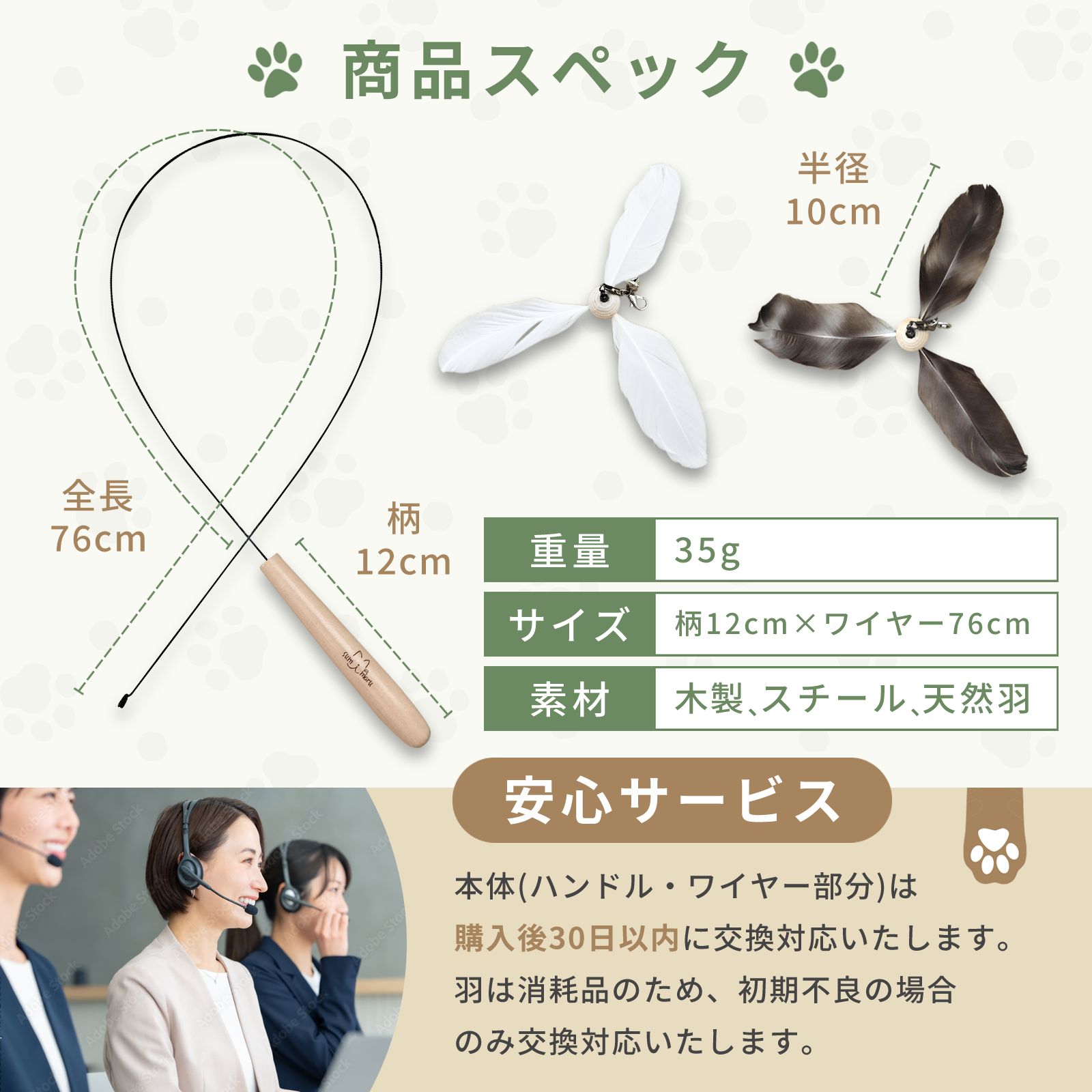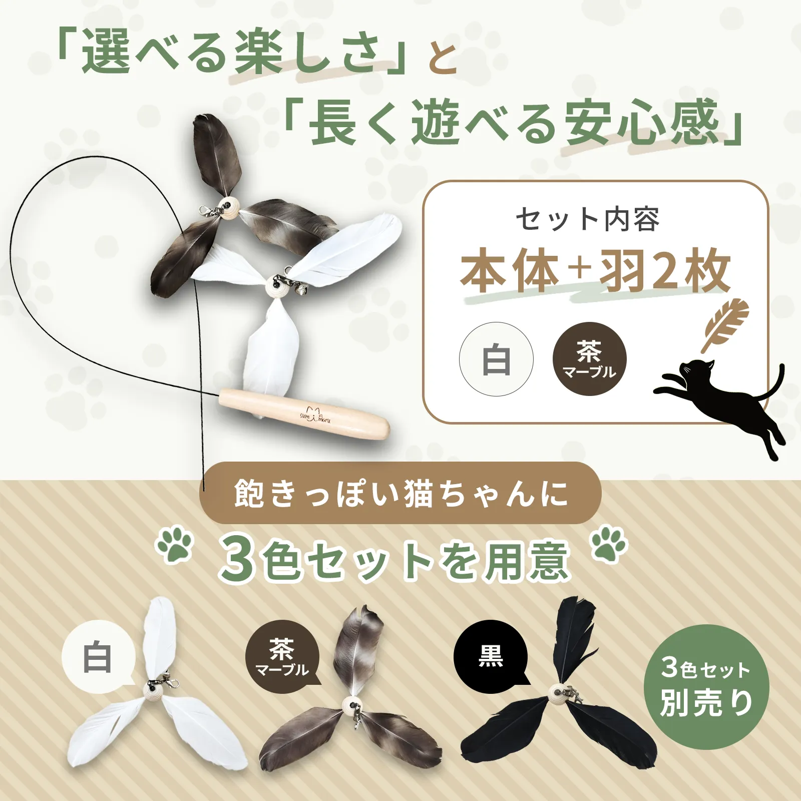 - 商品名: ねこじゃらし - 色: 白/マーブル - 素材: 天然素材(羽) - 特徴: 弾力のあるワイヤーで自然な動き - 使用対象: 猫 - 付属品: 2色羽付き ご覧いただきありがとうございます。