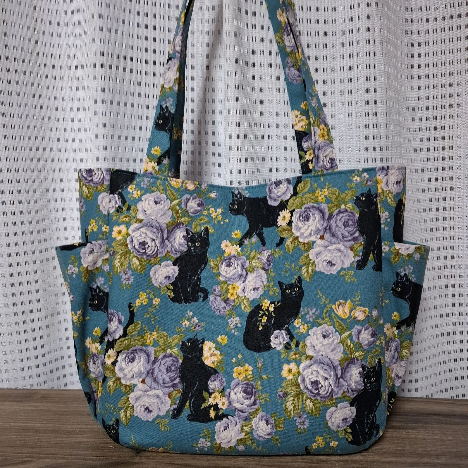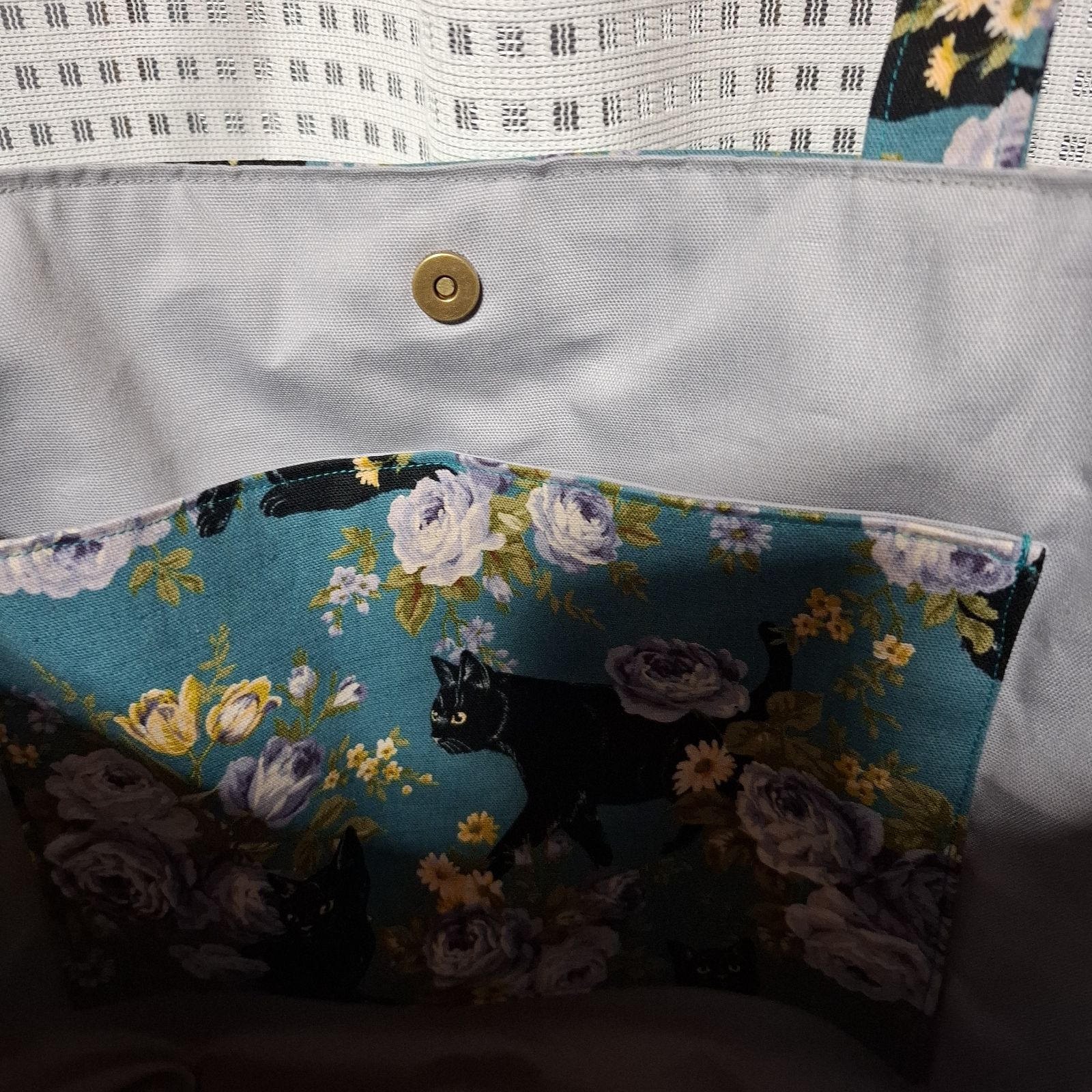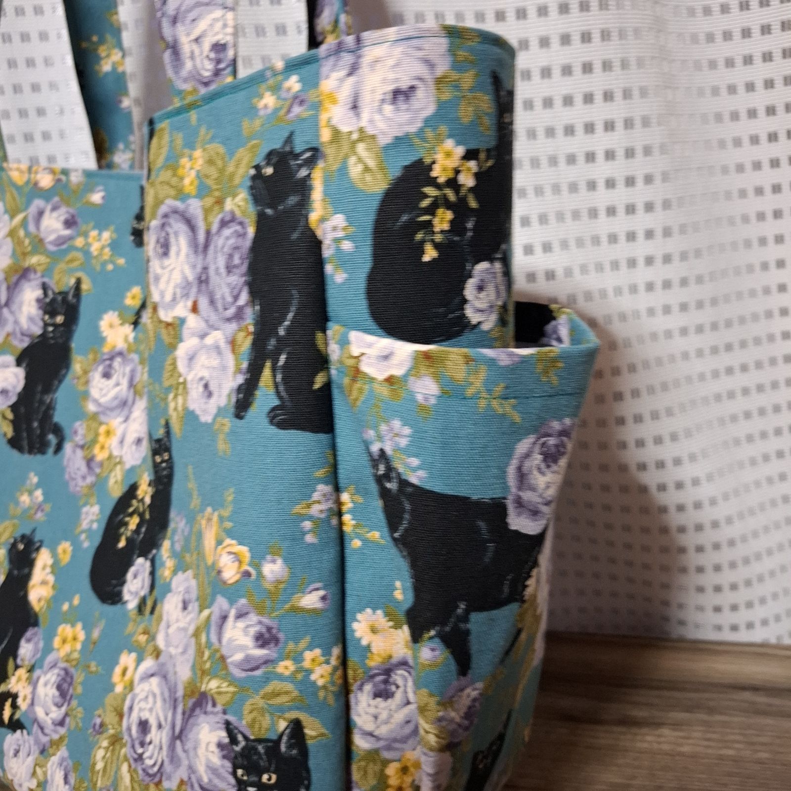 5種類の色から、お選びください。 こちらは、注文を受けてからの作成になります。 1週間程度お時間頂きます。 縦32㎝×横45㎝(内寸40㎝)×マチ10㎝ 持ち手60㎝(肩かけできます。) A4サイズが横に入ります。 内ポケット、マグネットボタン付き ※持ち手が短めが希望の方はお直し出来ますのでコメントください。 ★ハンドメイドによる作品です。 縫い目のズレなどがあります。 ご了承お願いいたしますm(_ _)m 黒猫 猫 薔薇 花 ハンドメイド バック