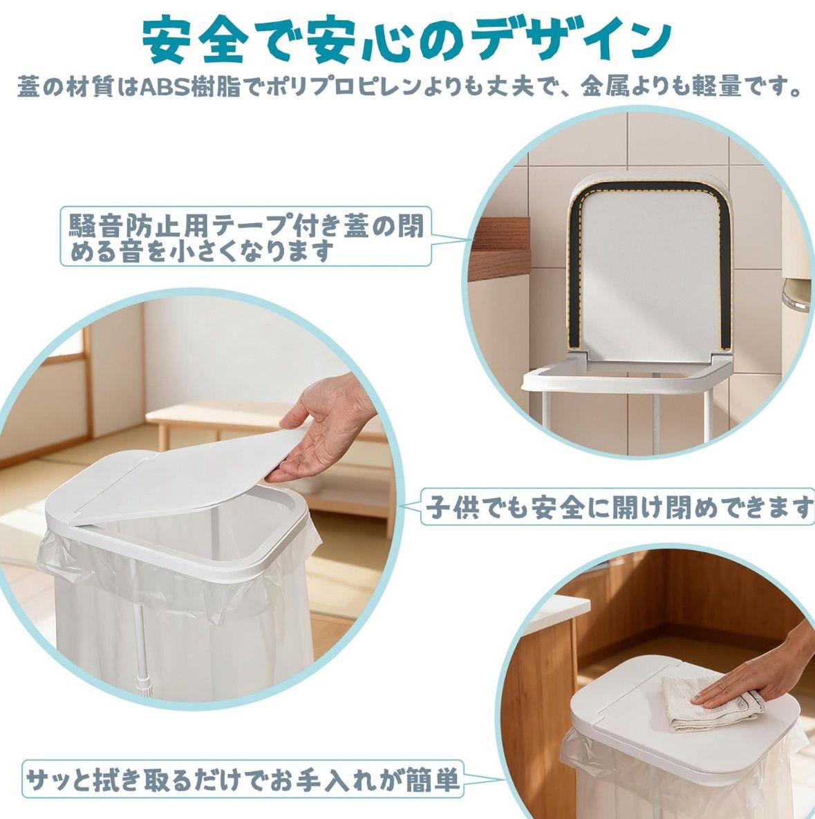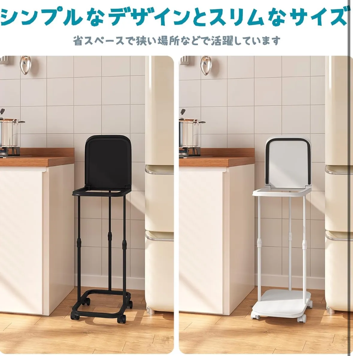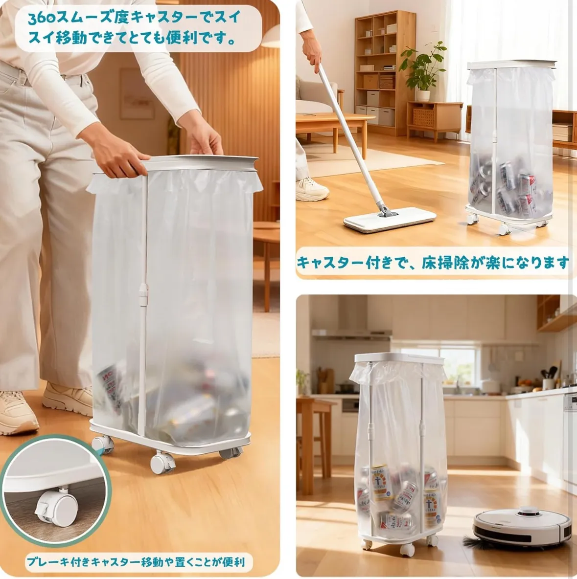 ゴミ箱の汚れが気になりませんか?本製品は壁なしで袋をかけるだけです。蓋が汚れたら水で直接洗えるので、手軽に清潔に保てます。キャスターとフットパッドが付属するので場所に応じて設置ができます。キャスターがないと、掃除機を使うなどで動かすのに不便です。360度キャスター付きで、スイスイ移動できてとても便利です。この商品を使って、ゴミ箱の汚れストレスから解放!