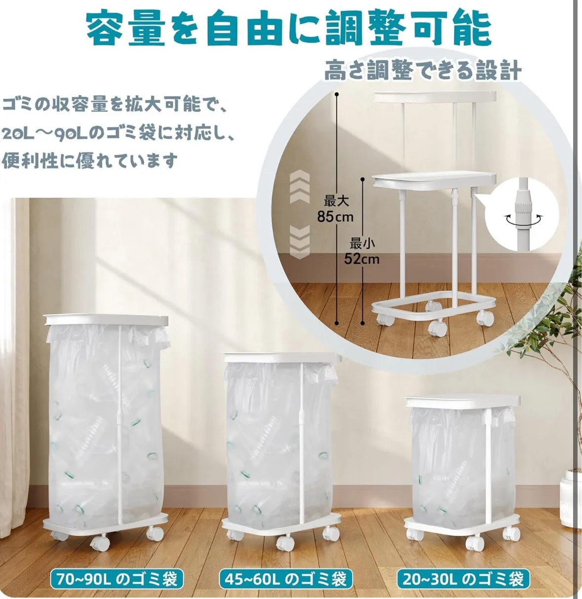この商品の高さは47~78cm(キャスター・アジャスター高さは別)の間で段階なく自由調節でき、ゴミの収容量を拡大可能で、20L~90Lのゴミ袋に対応し、便利性に優れています。ゴミは日々の生活で驚くほど溜まりますが、回収日しか捨てられないルールがあるので、箱型のゴミ箱と違ってゴミ袋の最大容量まで使えます。このゴミ袋ホルダーを使うと、使い勝手がすごくいいです!