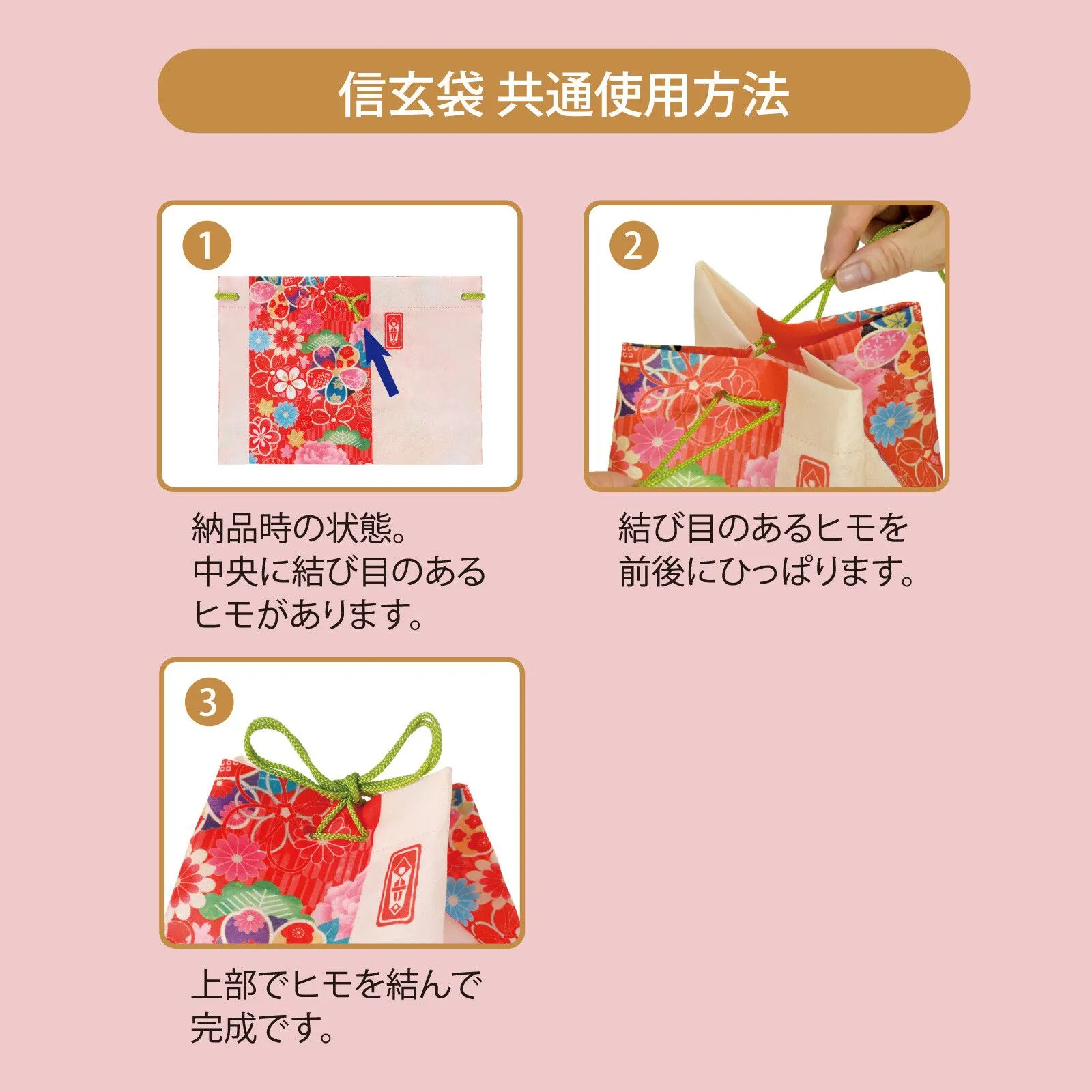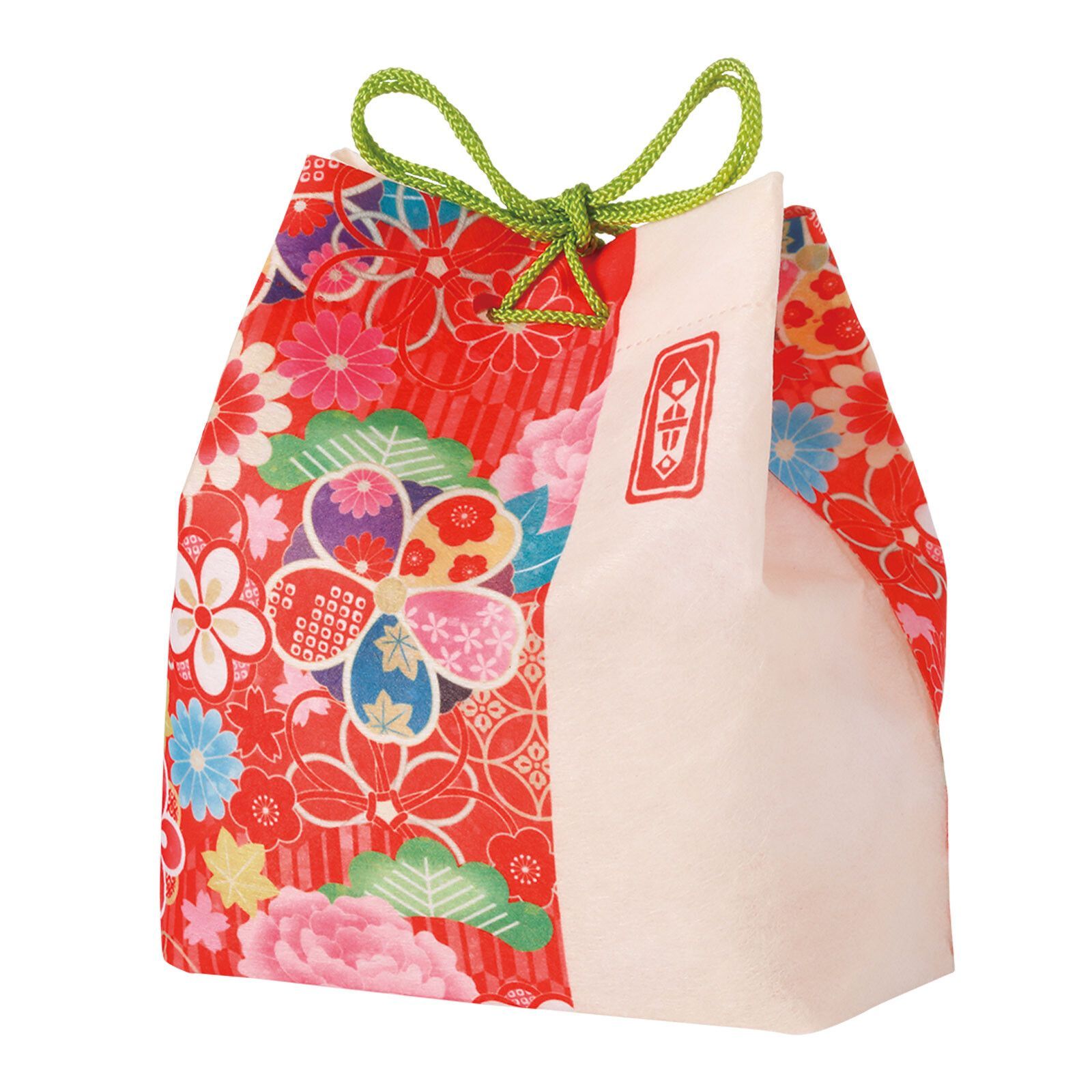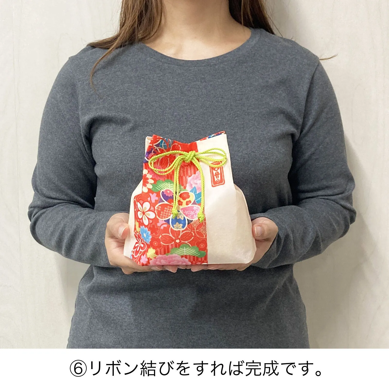 冬のギフトを格上げする「信玄袋 みやび柄FP」。松や牡丹、梅など縁起の良い和柄をあしらい、落ち着いた中にも華やかさを演出します。巾着タイプなのでヒモを引くだけで美しく仕上がり、ラッピング作業もスムーズ。熨斗風デザインと矢絣柄の両面構成で、贈り物に強い印象を残します。マドレーヌ6個が入る実用サイズで、スイーツや和雑貨の詰め合わせに最適です。高級感と手軽さを両立した販促にも活躍するラッピング袋です。