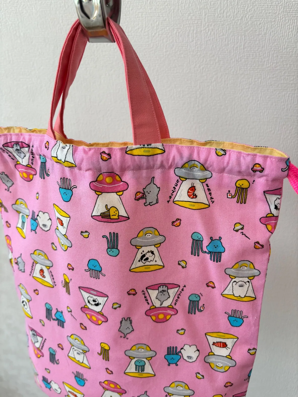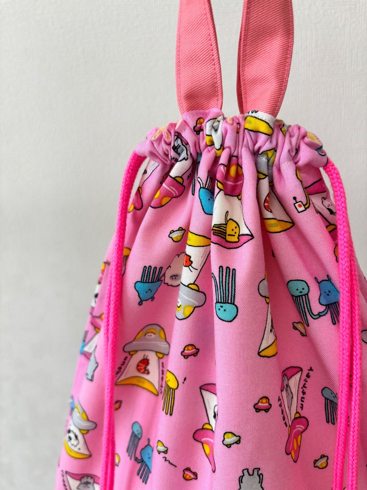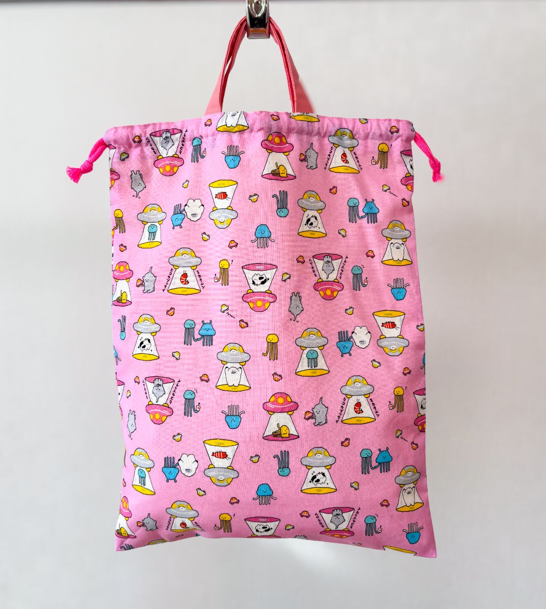 UFO 宇宙人 ピンク お着替え袋(^^) 持ち手付きお着替え袋、体操着袋、上履き入れに♪ ※オーダー不可商品。 無くなり次第終了です☆ ⬜︎⬛︎サイズ⬛︎⬜︎ 縦…39cm 横…29cm UFO 宇宙人 面白い ピンク 女の子 男の子 進級 新学期 お着替え袋 給食袋 巾着 習い事 幼稚園 小学校 保育園 裏地付き 上履き入れ シューズバッグ 持ち手付き 入学 入園 ネオンカラー