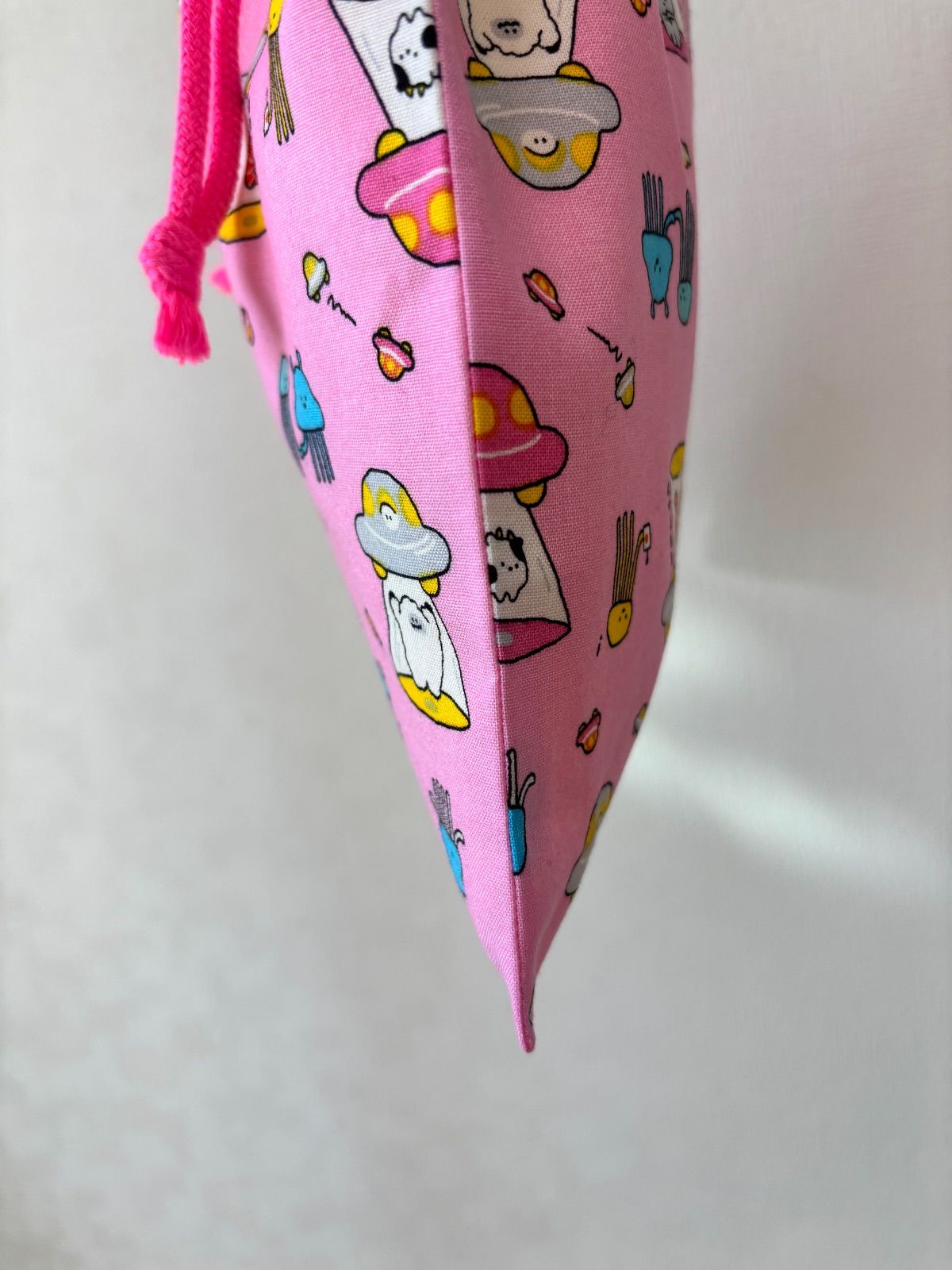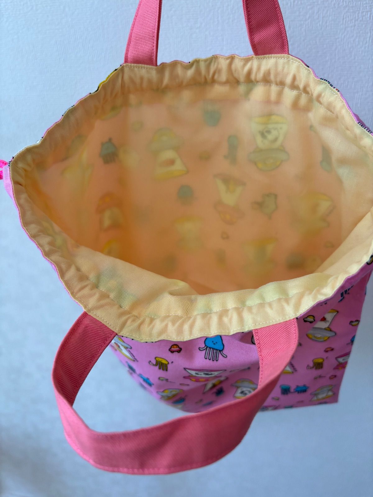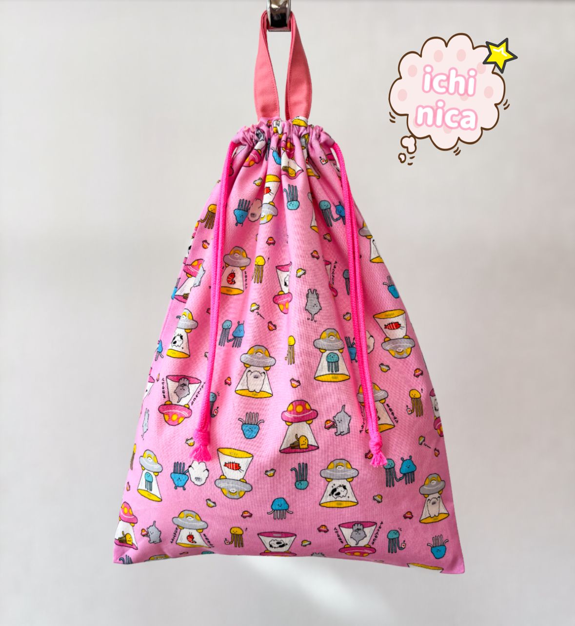 UFO 宇宙人 ピンク お着替え袋(^^) 持ち手付きお着替え袋、体操着袋、上履き入れに♪ ※オーダー不可商品。 無くなり次第終了です☆ ⬜︎⬛︎サイズ⬛︎⬜︎ 縦…39cm 横…29cm UFO 宇宙人 面白い ピンク 女の子 男の子 進級 新学期 お着替え袋 給食袋 巾着 習い事 幼稚園 小学校 保育園 裏地付き 上履き入れ シューズバッグ 持ち手付き 入学 入園 ネオンカラー