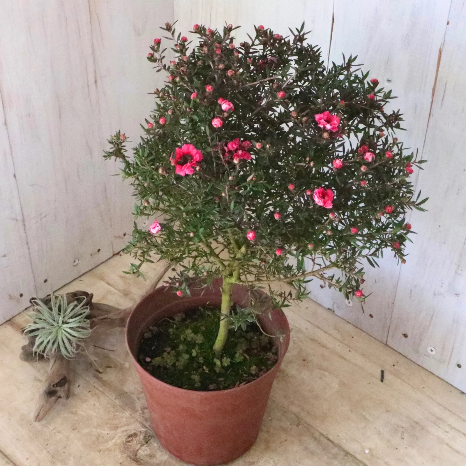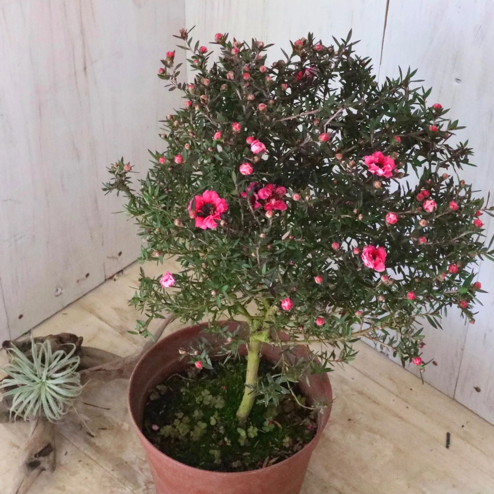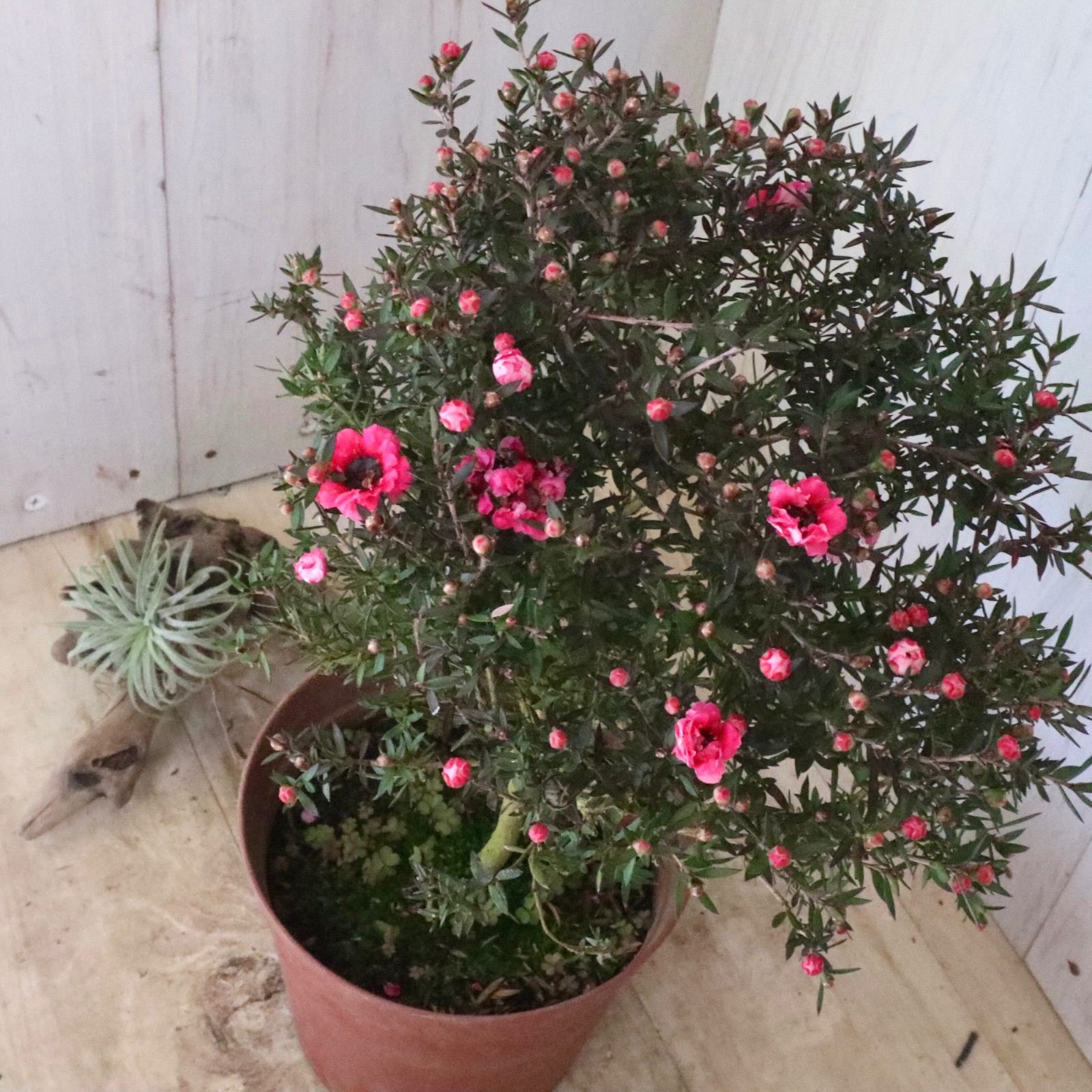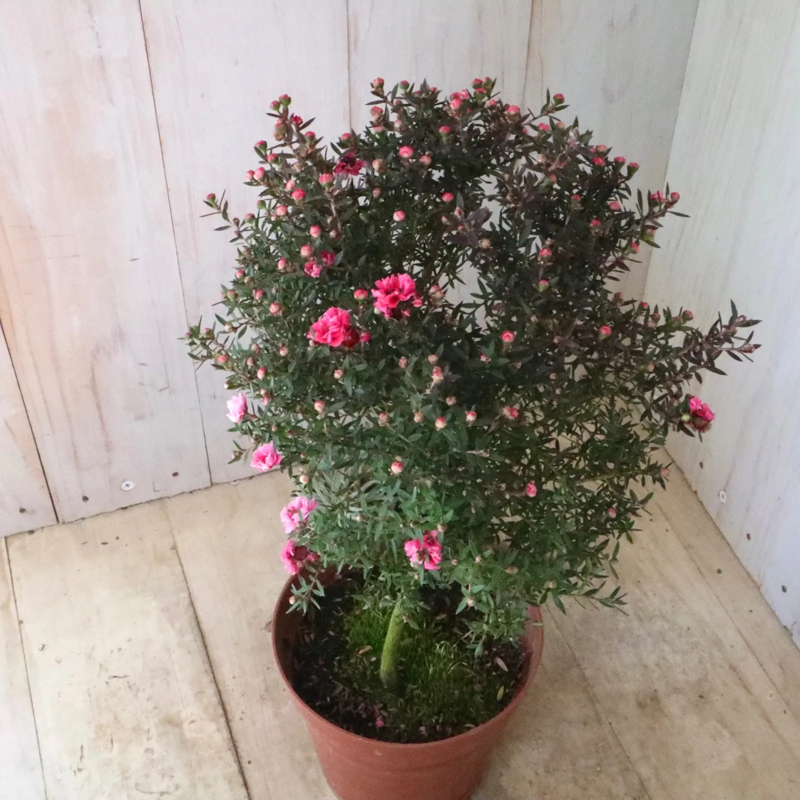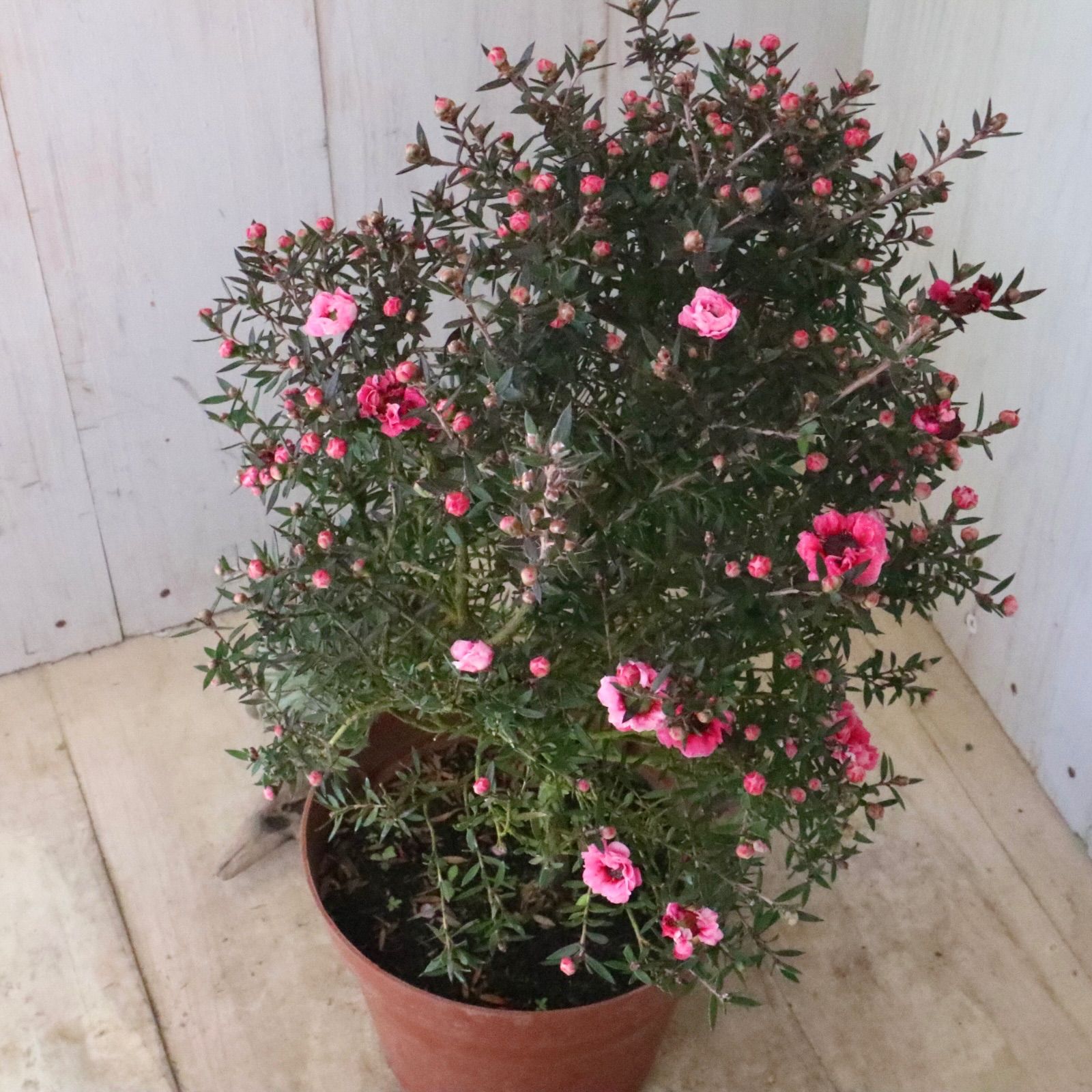◆◇ 八重咲きギョリュウバイ 濃いピンクです。 豪華な八重咲きになります。 ギョリュウバイはニュージーランド原産のティーツリーの仲間です。 梅の花に似た花を冬から春にかけて開花させます。 葉も花もとても小さく、枝も細く、また開花期間が長く丈夫で育てやすいので、冬の寄せ植えにも活躍する魅力的な樹木です。 ※花付きや枝ぶりは個体差がございます。 ※1鉢のお値段です。 ☆置き場所☆ 日当たりがよく、水はけ水もちのよい場所を好みます。 やや暑さに弱いので、鉢植えの場合は夏に半日陰に移動したほうがよいです。 ☆水やり☆ 乾燥と過湿を嫌います。 葉っぱが硬く、乾燥しているのかどうかわかりづらいので、水切れには特に注意が必要です。 鉢植えは、土の表面が乾いたことを確認してから水やりをします。 ☆全体の大きさ☆ 4寸鉢 ☆発送☆ 第4種郵便 事故補償、配達日時の指定がございませんのでご了承ください。 ※プラス500円でゆうパックに変更できます。