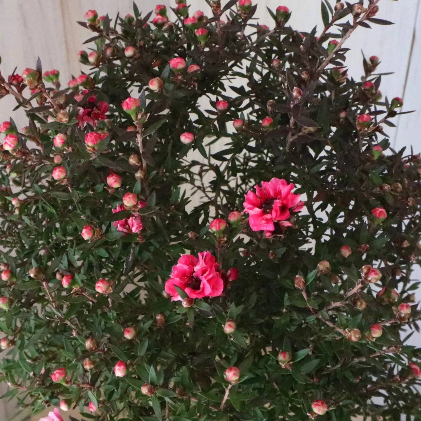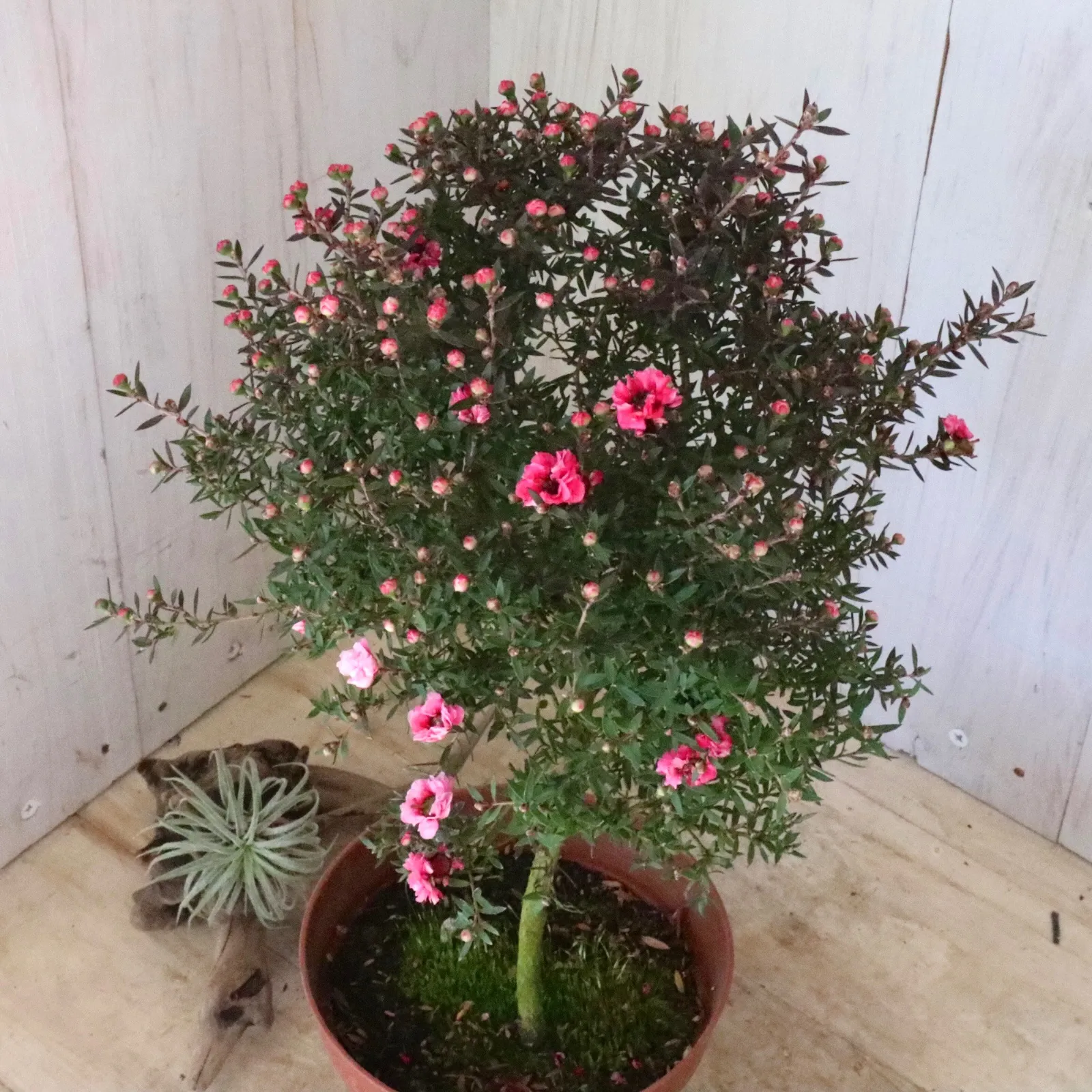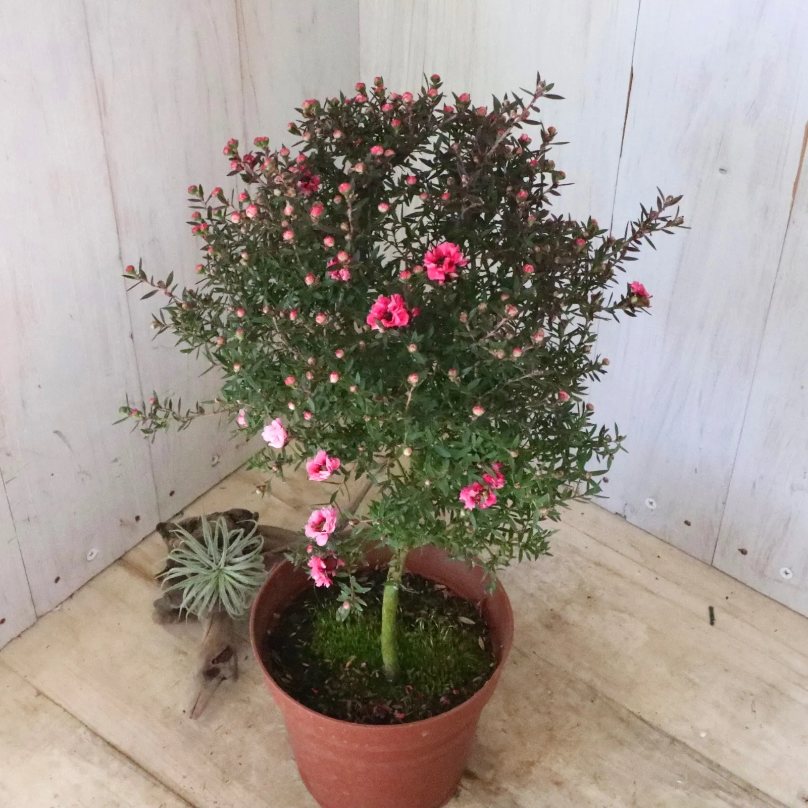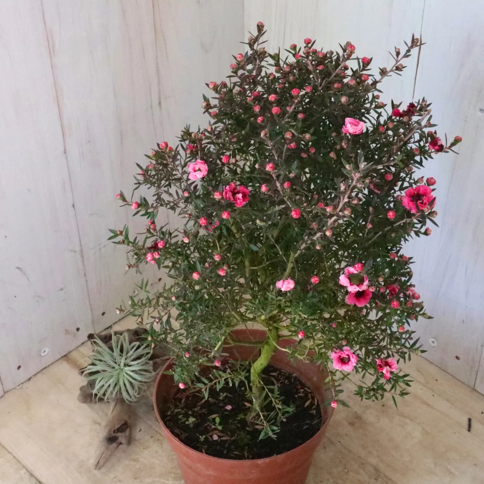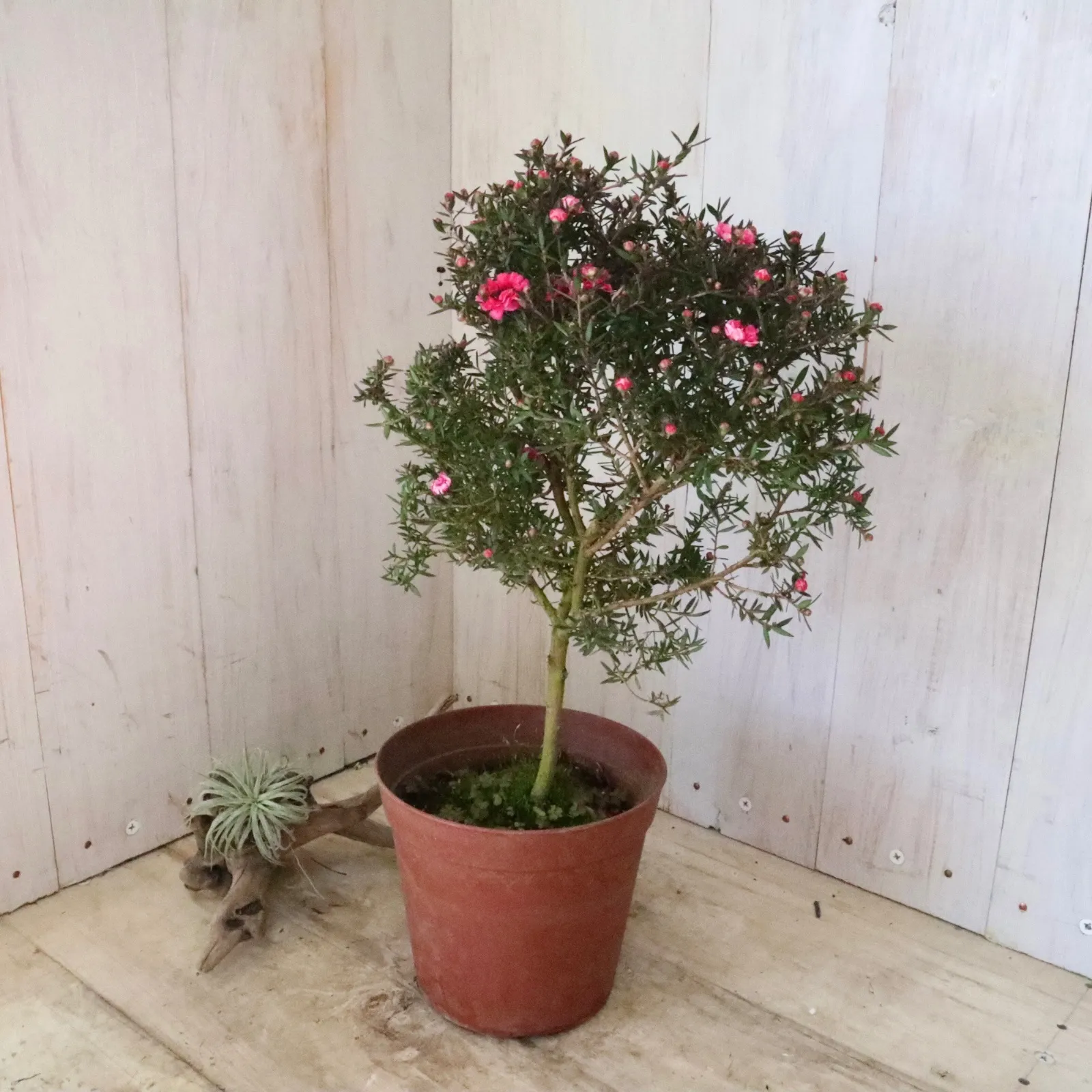 ◆◇ 八重咲きギョリュウバイ 濃いピンクです。 豪華な八重咲きになります。 ギョリュウバイはニュージーランド原産のティーツリーの仲間です。 梅の花に似た花を冬から春にかけて開花させます。 葉も花もとても小さく、枝も細く、また開花期間が長く丈夫で育てやすいので、冬の寄せ植えにも活躍する魅力的な樹木です。 ※花付きや枝ぶりは個体差がございます。 ※1鉢のお値段です。 ☆置き場所☆ 日当たりがよく、水はけ水もちのよい場所を好みます。 やや暑さに弱いので、鉢植えの場合は夏に半日陰に移動したほうがよいです。 ☆水やり☆ 乾燥と過湿を嫌います。 葉っぱが硬く、乾燥しているのかどうかわかりづらいので、水切れには特に注意が必要です。 鉢植えは、土の表面が乾いたことを確認してから水やりをします。 ☆全体の大きさ☆ 4寸鉢 ☆発送☆ 第4種郵便 事故補償、配達日時の指定がございませんのでご了承ください。 ※プラス500円でゆうパックに変更できます。