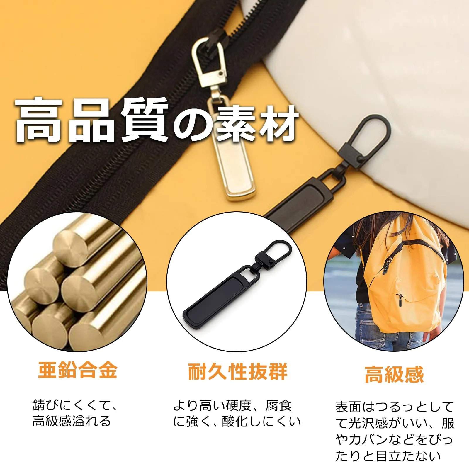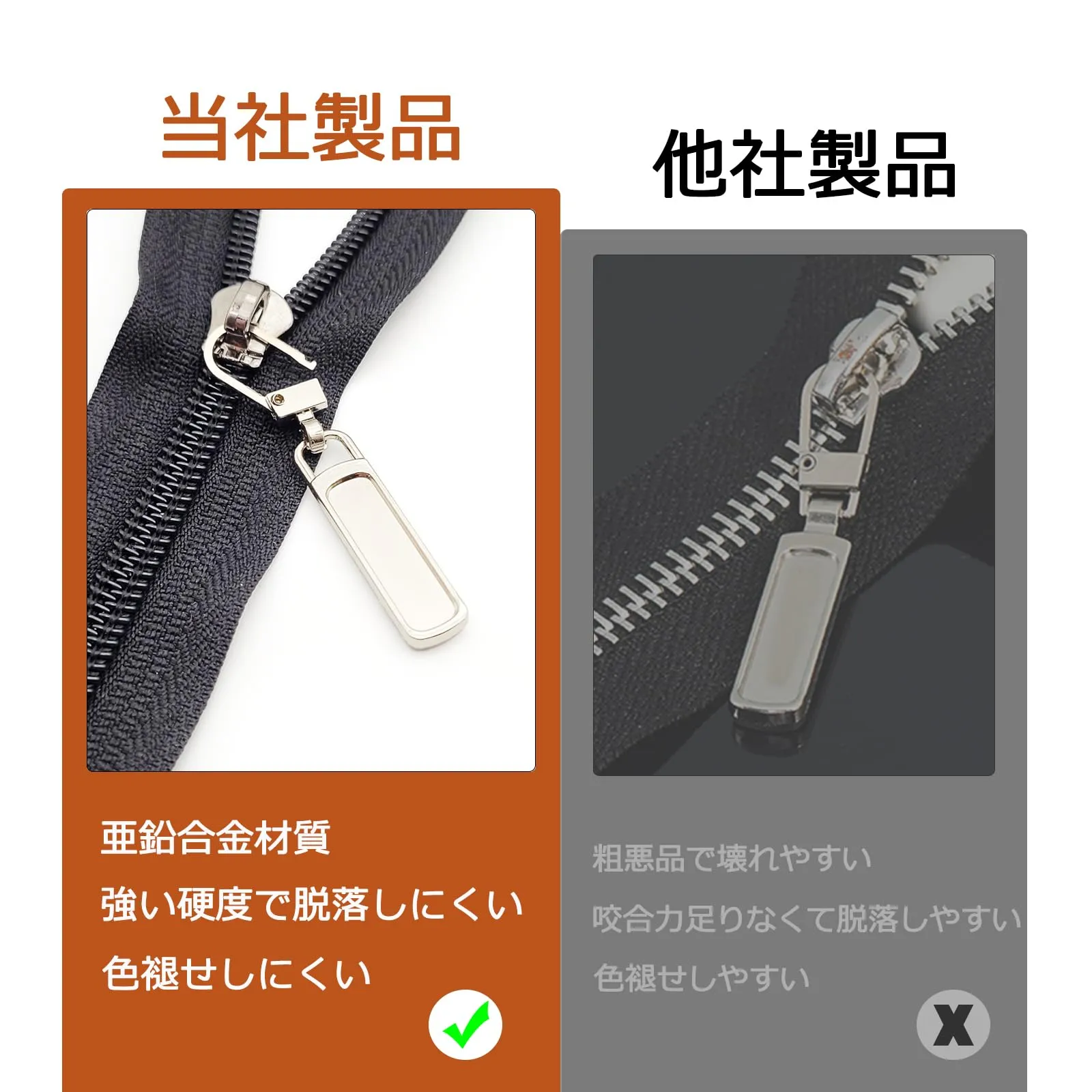 【亜鉛合金で錆びにくい】ファスナーの引手部分は亜鉛合金で製造し、より高い硬度、腐食に強く、酸化しにくい耐久性に優れた素材です。合金製なので強度が強く、簡単に切れたり折れたりしませんので、壊れにくいです。そして、耐久性は十分です。高品質な素材なので、錆びにくくて、高級感溢れるファスナー引き手です。