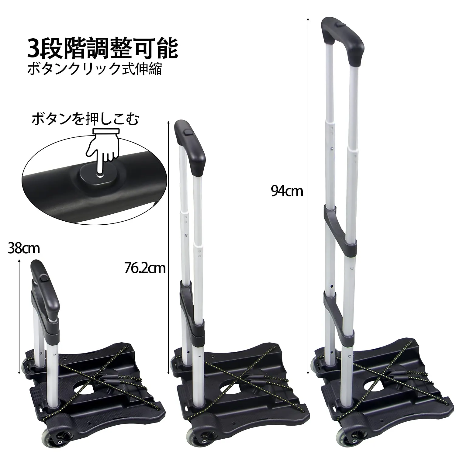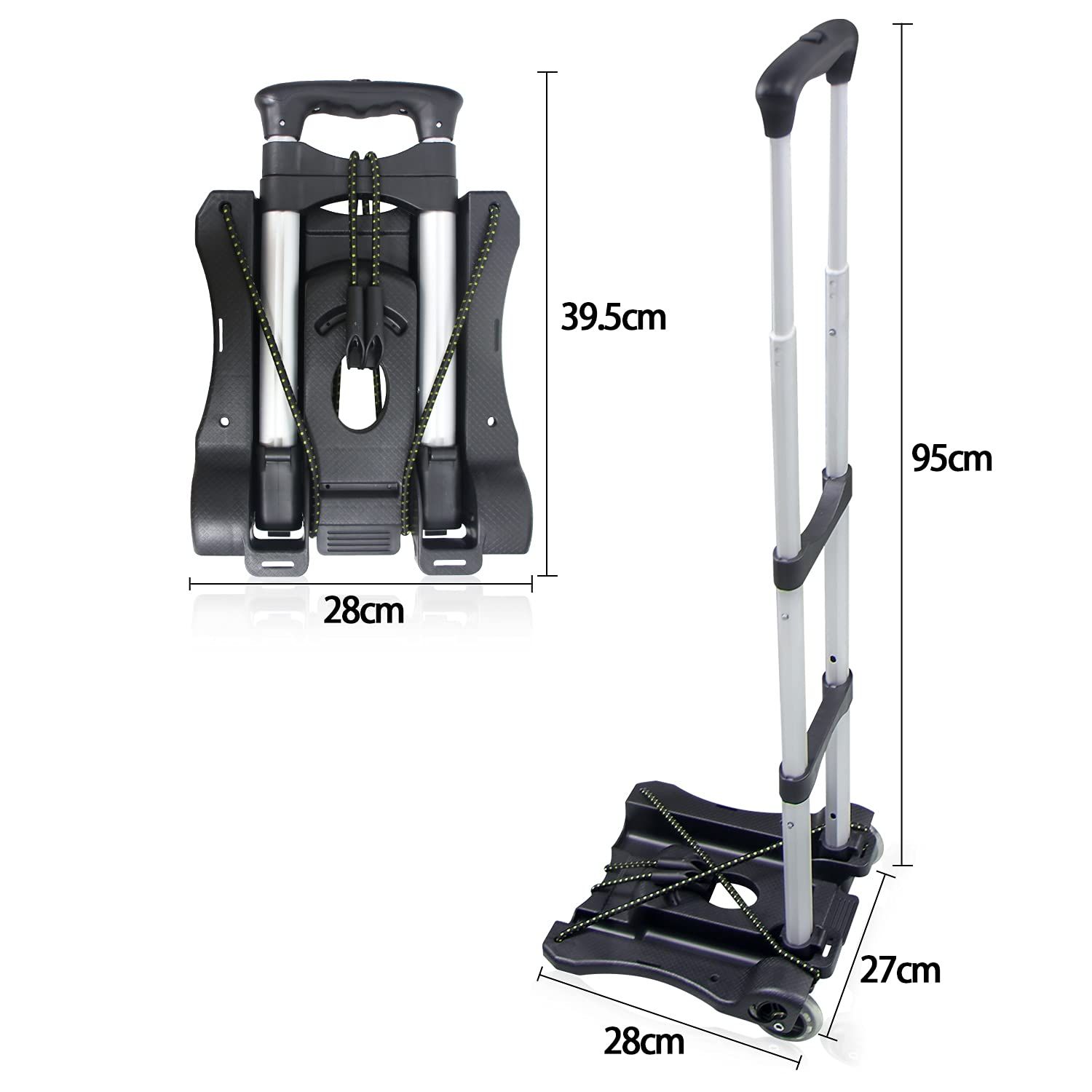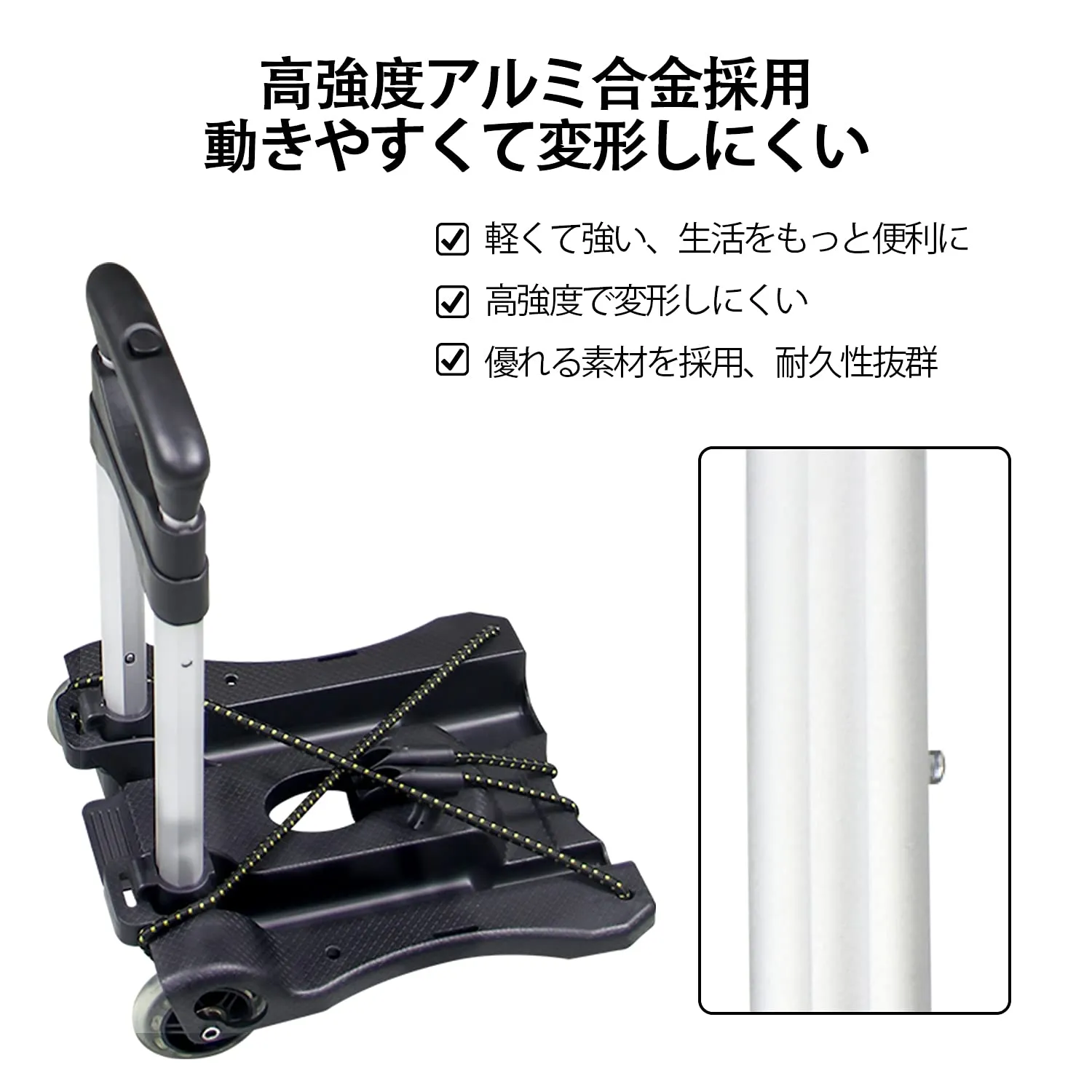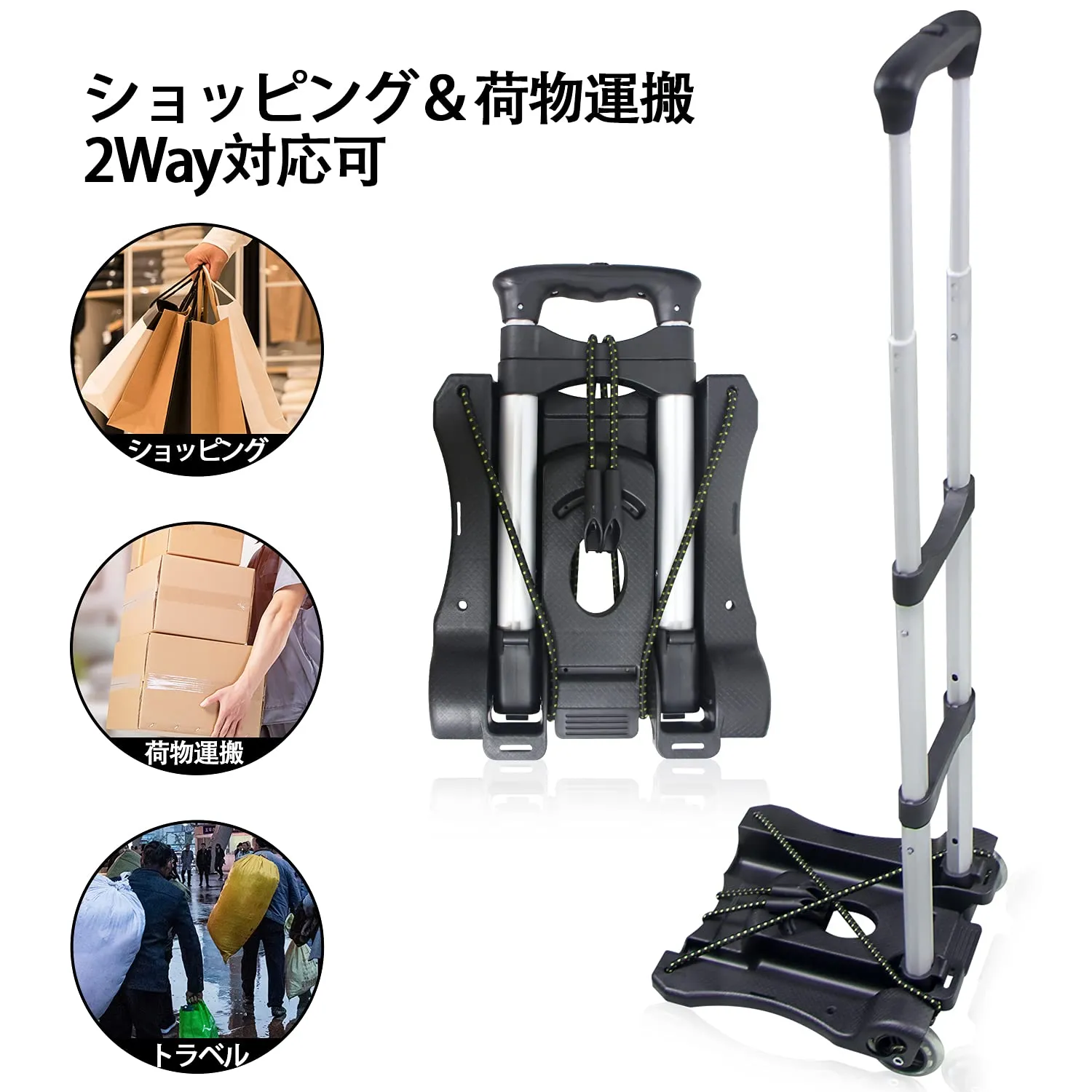 【軽量デザイン】27cmワイド設計の超軽量折りたたみキャリーカート、フック付きロープ2本付き