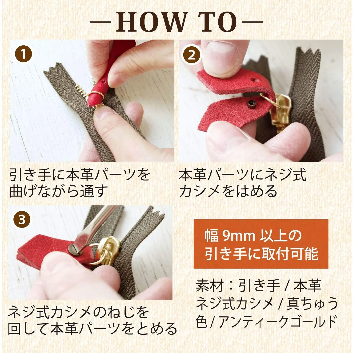 簡単に取り付けられる本革のファスナーパーツ。 持っているポーチや財布の引手のアレンジや、お直しにもおすすめ! 各色1個ずつの5個セットです!