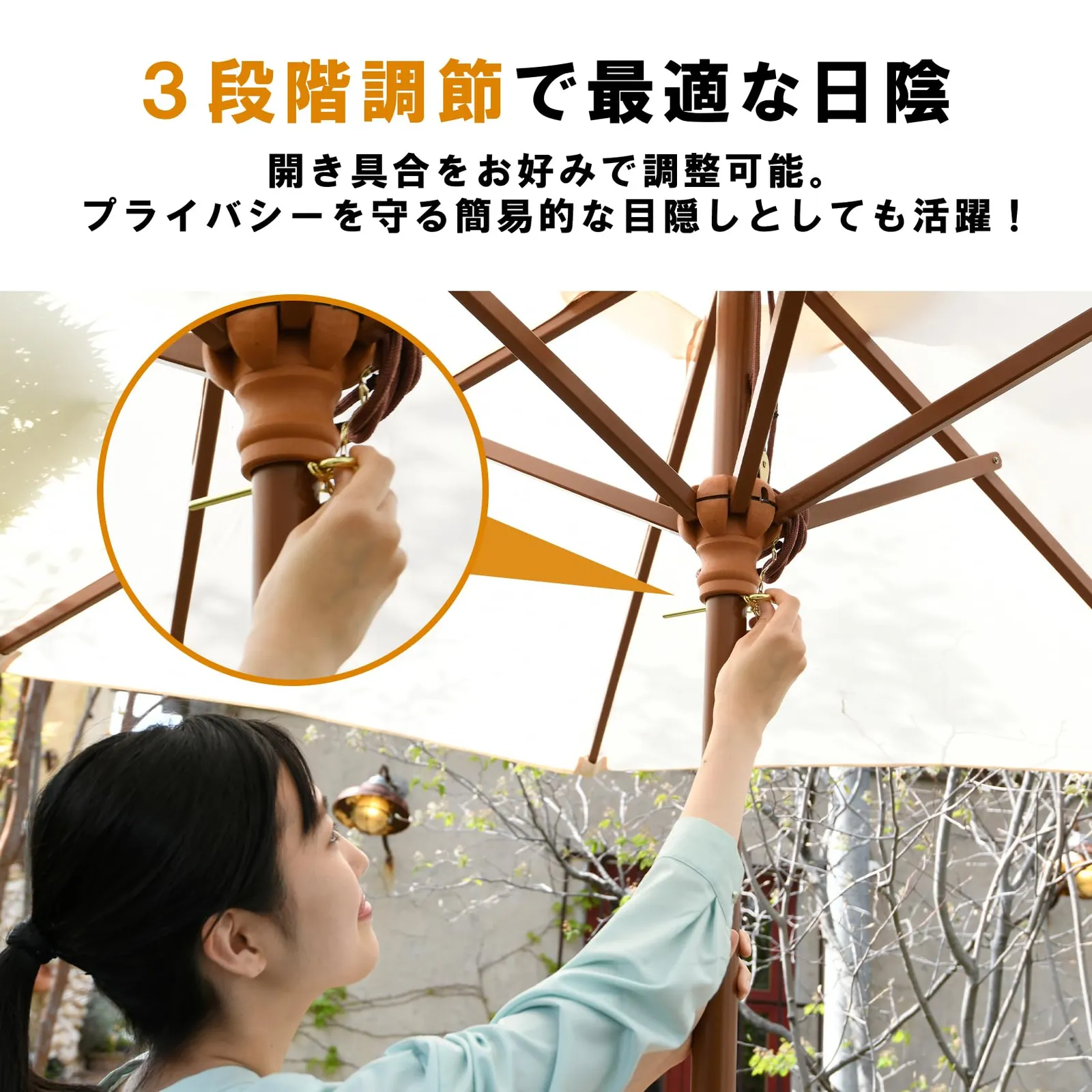 【特徴】お庭、ベランダ、バルコニーなどの日除けに便利な木製パラソルです(一部取付品)。紐を引くだけで簡単に設置できます。パラソルの開き具合はお好みで3段階調節できます。[直径約263/268/270cm] 雨にぬれても水を弾くので、お手入れも簡単です。