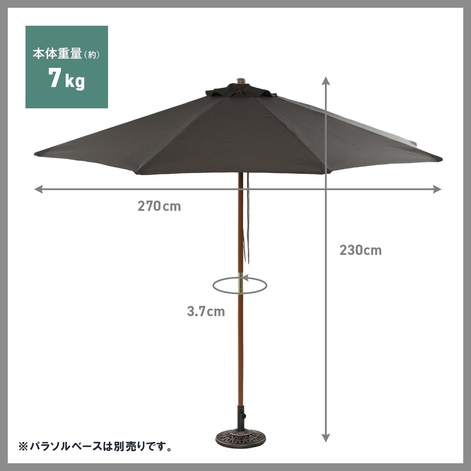【商品仕様】本体サイズ:幅270×奥行270×高さ230cm、支柱径:3.7cm/重量:7.0kg/材質:支柱=天然木、生地=ポリエステル/カラー:ブラウン