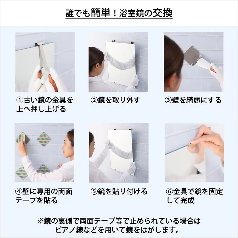 【DIYでも簡単に交換】 古い鏡の金具を取り外し、付属のミラーマット(専用両面テープ)と金具で取り付けるだけのシンプルな構造です。交換手順は商品ページ内にて詳しくご案内しています。