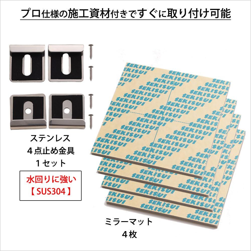 【取り付け資材が標準付属】 SUS304ステンレス製の4点止め金具セット(25mmビス付き)と、ミラーマット(90×90mm/厚さ3mm)4枚が標準で付属しています。DIYでの取り付けにも対応可能です。