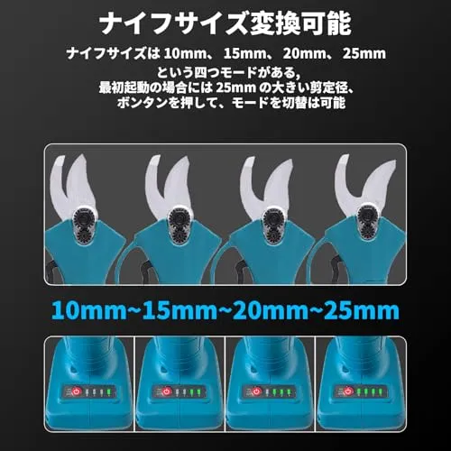 【4段開口部調節可能&安全で高効率】:電動ハサミは4段角度で自由に切り替えられます。4段刃の直径はそれぞれ:10ミリ、15ミリ、20ミリ、25ミリの4種類のモードで、電源ボタンを押して、モードを切り替えることができます。電動剪定バサミ、剪定シーンに合わせて、作業効率を高めます。15秒間無操作の場合、充電式剪定ばさみ自働的にオフになります。