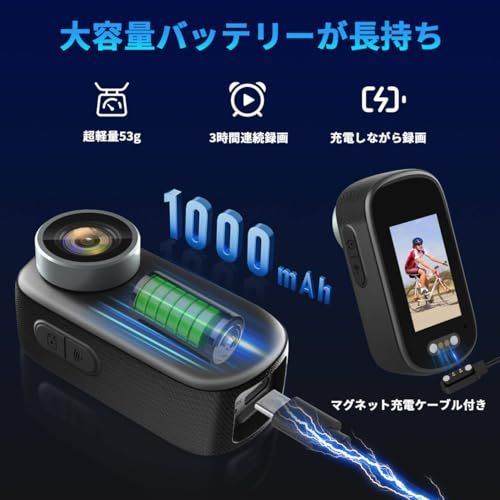 【1時間充電で3時間連続録画&充電中録画】電源配線不要、直感的な簡単操作のビデオカメラは内蔵1000mAのバッテリー、ただ充電1時間約3時間続稼働可能です。更に、移動電源や電源(コンセントなど)と接続して充電しながら録画もできて、電量不足を心配んなく、いつでも風景やアウトドアアクティビティの瞬間を美しく記録することができます。