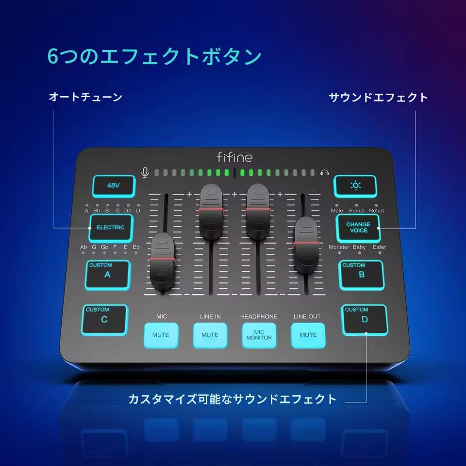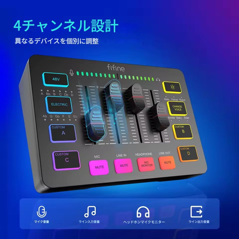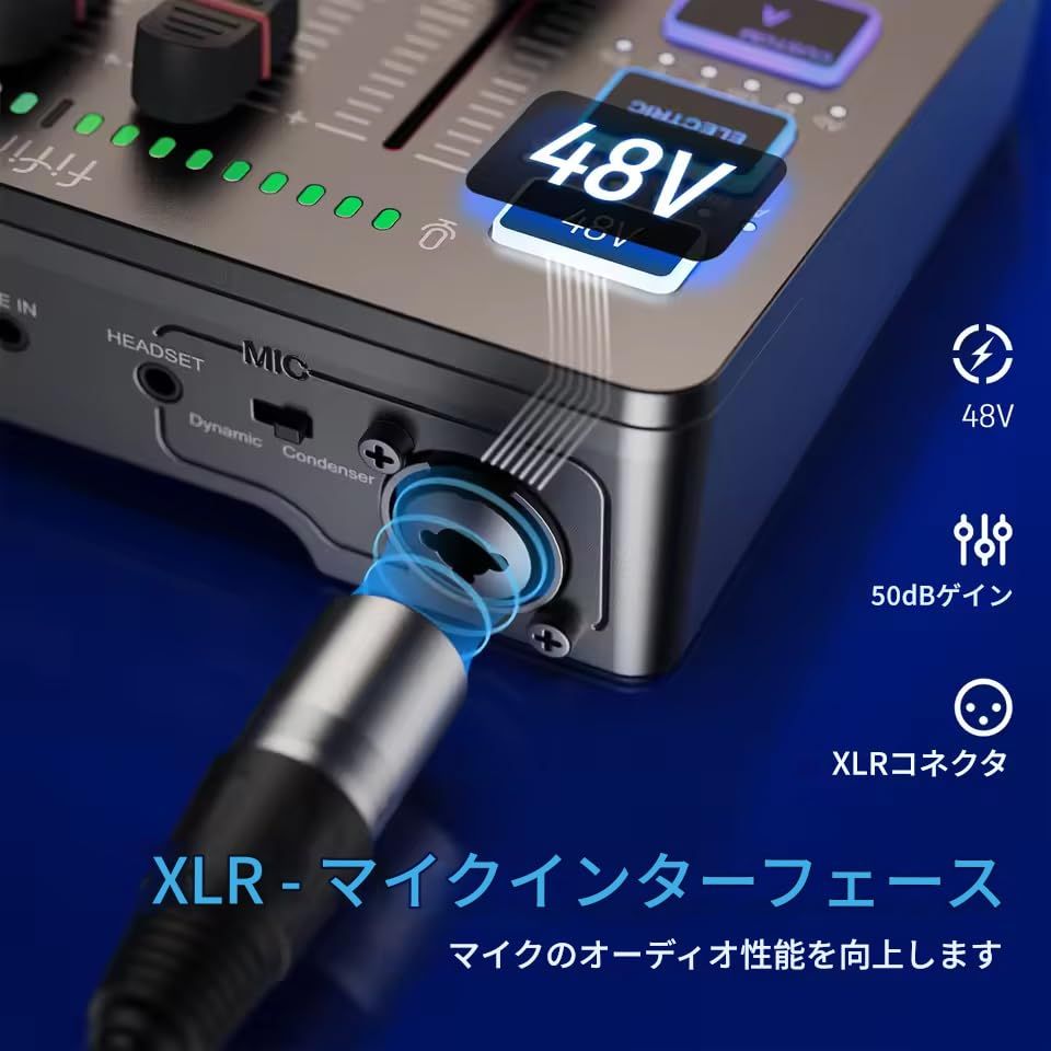4チャンネル設計 4つの個別コントロールチャンネルを備えたゲーミングミキサーは、様々なデバイスを個別に調整できます。ボリュームフェーダーを操作するだけで、より快適な操作性が得られます。 XLRマイクインターフェース ミキサーはXLRマイク入力に対応しており、マイクの音質向上に役立ちます。48Vファンタム電源を内蔵し、マイクの選択肢が広がります。