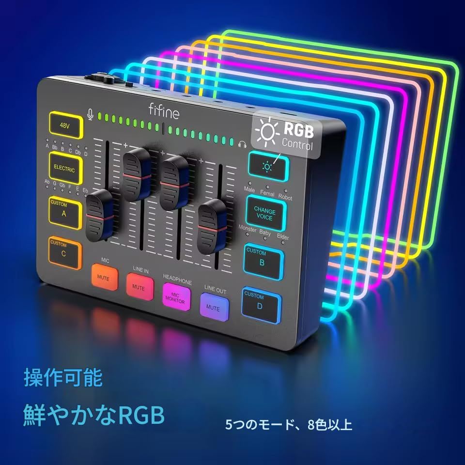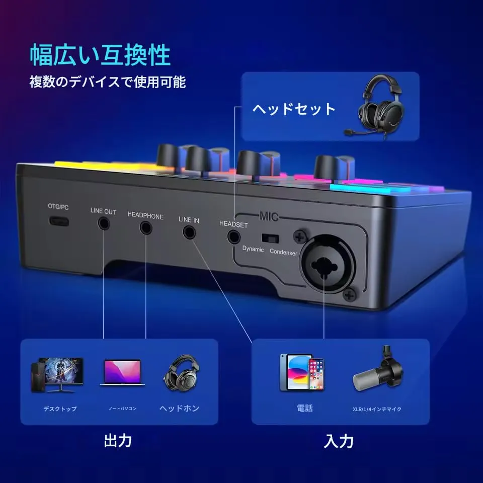 エンターテイメント用途 鮮やかでクールなRGBライティングは、ライブゲームやゲームボイスの配信時に、ゲームの雰囲気を盛り上げます。ボイスチェンジ、サウンドカスタマイズボタン、電子ボタンなど、ライブエンターテイメントストリーミング中に視聴者とのインタラクションを増やし、レコーディングプロセスを全く新しいレベルに引き上げます。