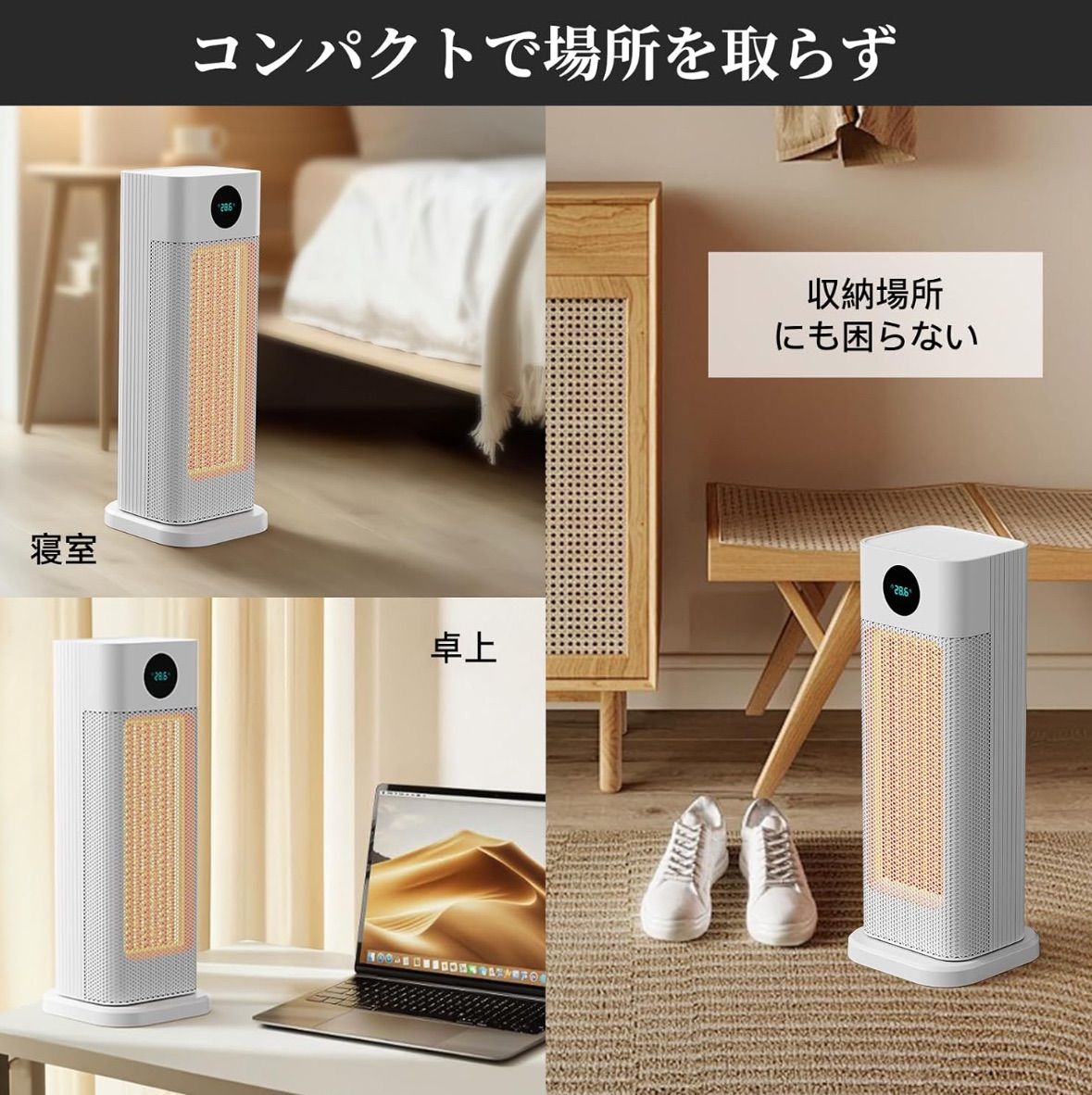 コンパクトサイズ(152×152×396mm)ながら、家中のあらゆる寒いスポットで活躍。リビングの足元暖房、仕事中のデスク周り、キッチンでの料理時、トイレや脱衣所の寒さ対策など、冬の日常生活を快適にサポート。縦長の吹き出し口設計で、足元からひざ下までしっかり温めます。インテリアに溶け込むシンプルなデザインで、どのお部屋にも違和感なく設置可能です。