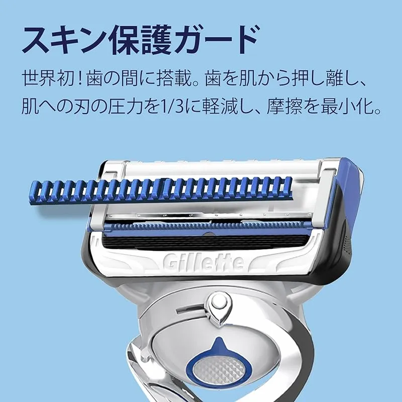 【商品概要】 スキン保護ガード世界初。刃の間に搭載。刃を肌から押し離し、肌への刃の圧力を1/3に軽減し、摩擦を最小化。