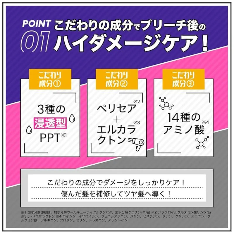 【こだわりの成分でブリーチ後のハイダメージをケア!】3種の浸透型PPTや、ペリセア・エルカラクトン、14種のアミノ酸などのこだわりの成分を配合し、傷んだ髪を補修してツヤ髪へ導きます。