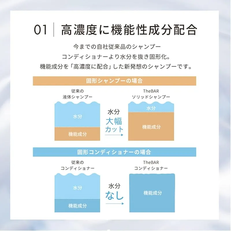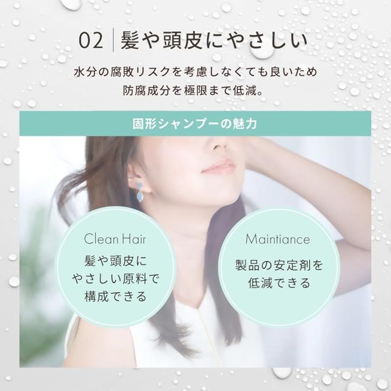 当製品は、従来の液体シャンプーやコンディショナーを固形化し、ヘアケア成分が豊富に含まれている、きしみやごわつきの少ない"固形シャンプー"と"固形コンディショナー"のセットです。液体から水分を抜くことで機能成分が濃密に残り、少ない量でもよく泡立ち、滑らかな洗い心地と仕上がりを実現しています。