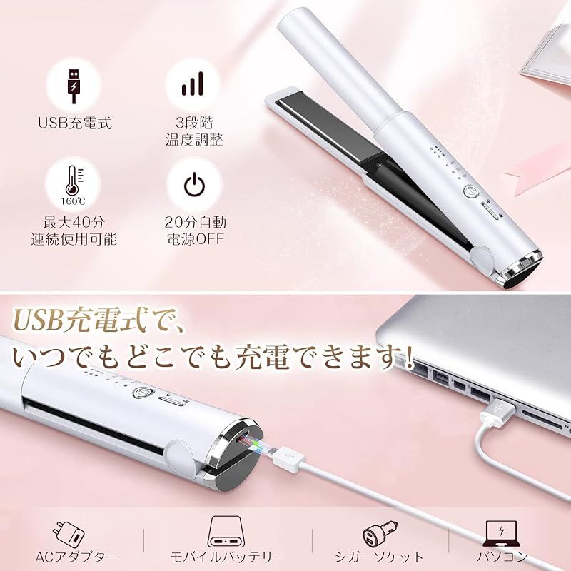 このストレートヘアアイロンは高品質リチウムイオン電池を内蔵し、1回のフル充電で最大40分(160℃の場合)連続使用可能です。持ち運びに便利なコードレスタイプ、USB充電式でコンセント不要、学校や会社などでの急なヘアセットもOK。旅行や出張などに1つあると便利!バッグ収まるサイズ感だから常に持ち運びができる便利なアイテムです。