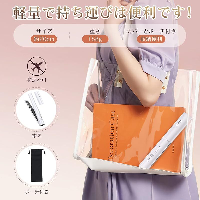 持ち運びに適した軽量でコンパクトな小さいサイズ。重量はたったの158g、サイズ:約205mm*30mm*30mm、バッグに入れてもOK!!(収納に便利な専用ポーチ付き)パッケージ内容:コードレス ヘアアイロン*1、充電ケーブル*1、ポーチ*1、日本語取扱説明書*1。お買上げから、最大1年間の付き、万が一、初期不良や自然故障など不具合が応じた場合、(「アカウントサービス」>「注文履歴」>「販売元」>「質問する」注文番号は領収書に替わります。)遠慮なくご連絡してください。