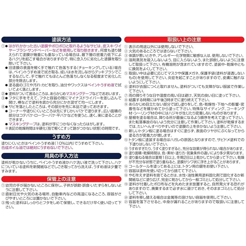【商品概要】 サビの上から直接塗れる、トタン用の高光沢塗料です。 1回塗りで仕上がりますので作業性が抜群です。 特殊強力防サビ剤がサビの進行を抑え、長期間素材をサビから保護します。 特殊アクリル樹脂の採用で耐候性が抜群です。 密着力が強く、ガルバリウム鋼板にも塗装が可能。 消防法上の非危険物(指定可燃物) 用途:(屋内外区分:屋外用)屋根、とい、ひさし、下見板、へいなどのトタン板、カラートタン、ガルバリウム鋼板、屋外の鉄部や木部 (標準)塗り回数:1回塗り (標準)塗り面積:3/21~32 (タタミ13~19枚分) 乾燥時間:夏期/2~3時間 冬期/5~8時間