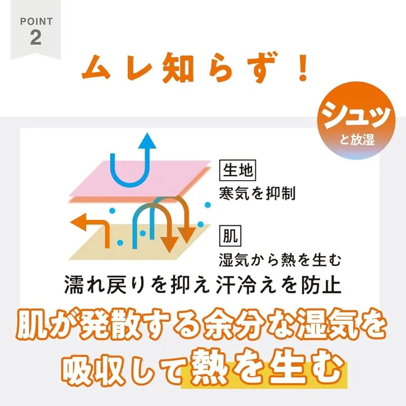 冬の汗冷えどこへやら・サッと汗を吸って、漏れ戻りを抑える ・シュっと、汗ムレ軽減 ・湿気を吸って、パッと発熱 糸と編地の特殊構造によるテクノロジーが汗を吸って、濡れ戻りを抑えることにより、冬の汗冷えを防ぎます。また、湿気から熱を生み、さらに、衣服内の暖気を逃さず閉じ込めます。吸湿発熱 裏起毛 中厚生地ベーシックな前あきタイツ足口がゴム仕様になっているので、フィット感があり、生地2重なので、暖かい。