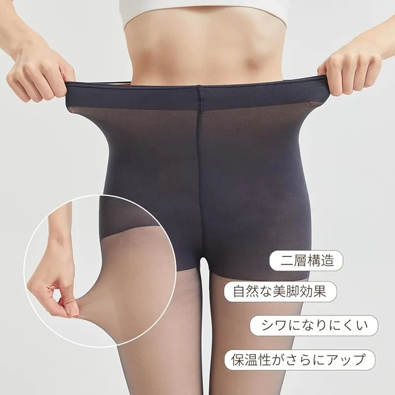【保温と美脚を両立する着圧設計】 脚のラインにフィットする立体裁断と程よい着圧が、余分な脂肪を整え、美しいシルエットを作ります。厚手のタイツでありながら、透け感で脚がすっきりと見える着やせ効果が期待できます。