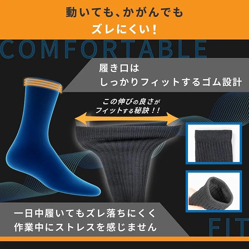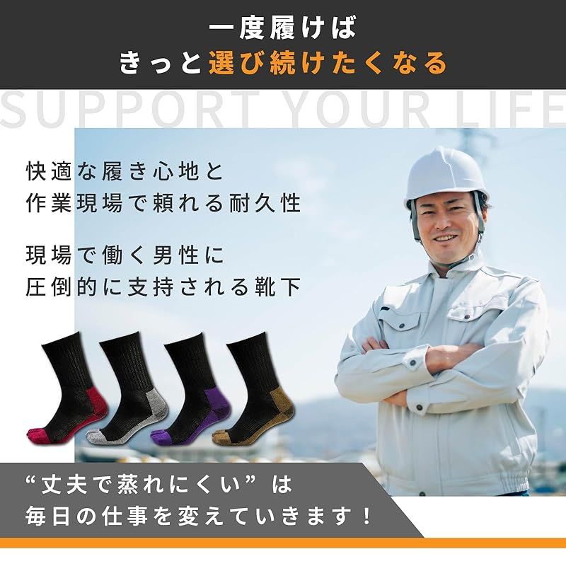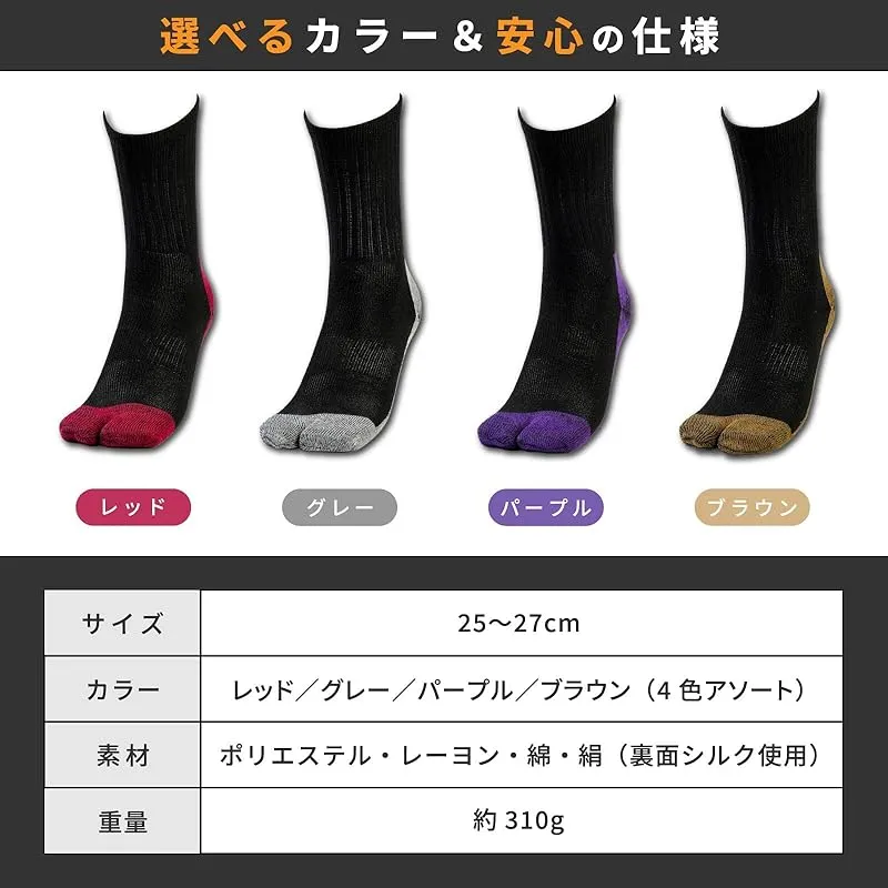 表面は「綿素材」、肌に触れる裏面は「シルクを使用した素材」で編み立てた靴下です。 「強くて爽やか」という綿のメリットと「冷え防止」、「通気性が良くムレにくい」、「天然の抗菌性」というシルクのメリットも併せ持つ優れた逸品です。蒸れや匂いの気になる方にオススメです!つま先からカカトまで2重編みにした厚底タイプで、丈夫に出来ているので、安全靴やハードな作業にピッタリ。黒色のベースに底を、赤、グレー、紫、茶色とオシャレなカラーの4足セット 品質:綿、シルク、ポリエステル