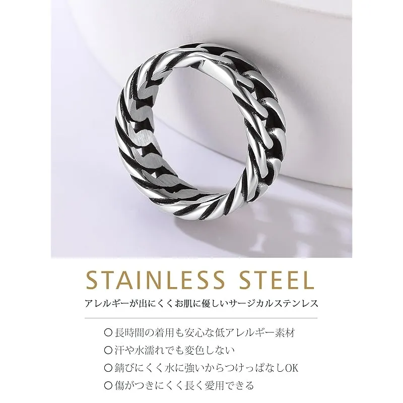 【サージカステンレス製】喜平リング全体にサージカルステンレスを採用します。サージカルステンレスは色落ちにくく、アレルギーになりにくく、頑丈で優れた金属です。金属アレルギーを心配する方もご安心。高級感が漂う洗練されたデザインの指輪、レディースはもちろん、メンズもおすすめします。