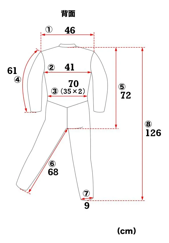 (襟元からパンツのすそまでの長さ。衿に縫い目のない商品は衿最上部から2cm下の位置からパンツすそまで)