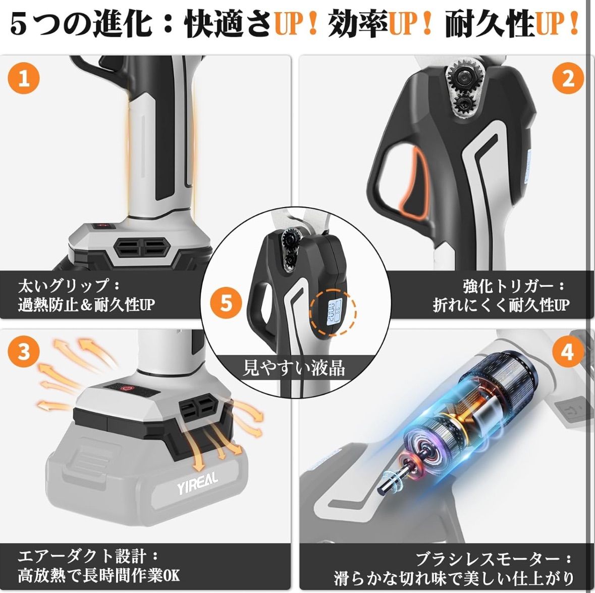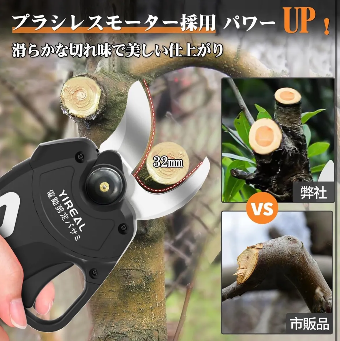 鋏の刃は日本製のSK5高炭素テフロン鋼から作られて高硬度で切れ味抜群です。ブラシレスモーター搭載してパワーが強くて、32mmまでの生木を1秒に瞬時に切断でき、切れ味が良くて切断面が平にキレイ、植木の健康を守れます。