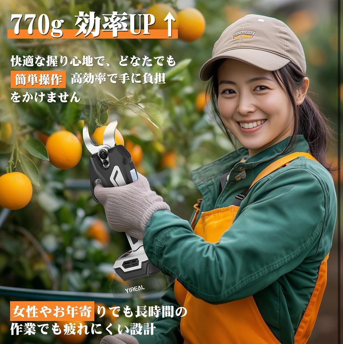 事故を防ぐために電動剪定ばさみを作業する時に、トリガーを素早く2回連続引く必要があり、更に1分間ぐらいに作業していない場合はハサミが再起動する必要があり、そうしなければ刃が正常に動作しません、これらによる誤って切断するリスクを大幅に減ります。プロ監修なので実用性と品質に大切に持っています、商品を出荷する前に全数検品しました、お客様が楽しく長く使うように努力しております。