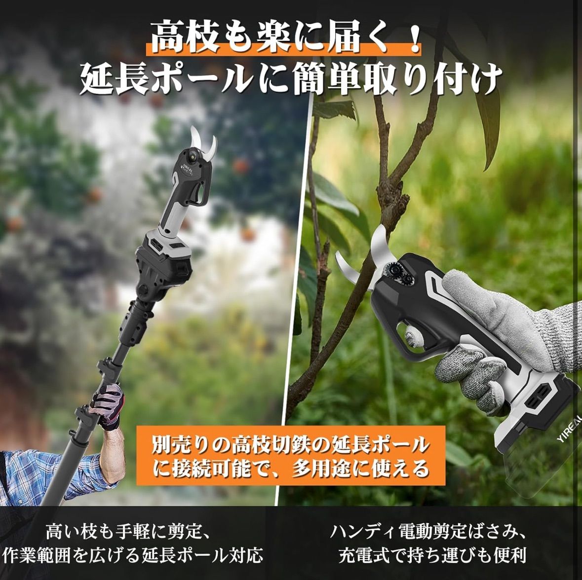 最大切断径32mmの枝を楽々に切れます。開き口は半開・全開の2段階に調節できる、半開なら小さな開口は作業時間と電力を節約し、全開なら太い枝を簡単に切れます。弊店の電動バサミは山本造園会社監修で植木屋さんが楽に剪定作業するために開発しました。この10年に世界中2万の造園会社に10万以上の植木屋さんが利用しています。