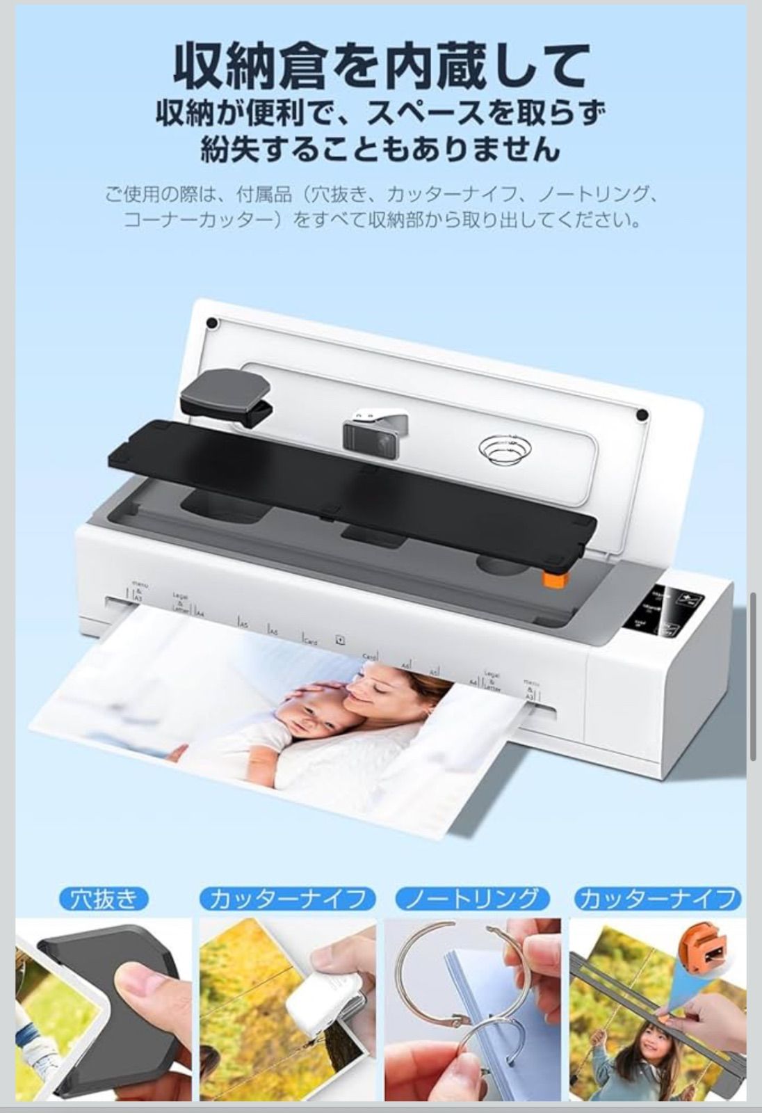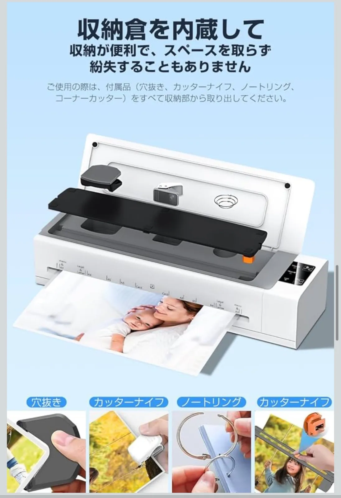 本体に加え、ペーパーカッター、パンチ、角丸カッター、ノートリング3個、さらに各種サイズのラミネートフィルム20枚がすべて同梱。※フィルムは80μm、150μmまで対応。