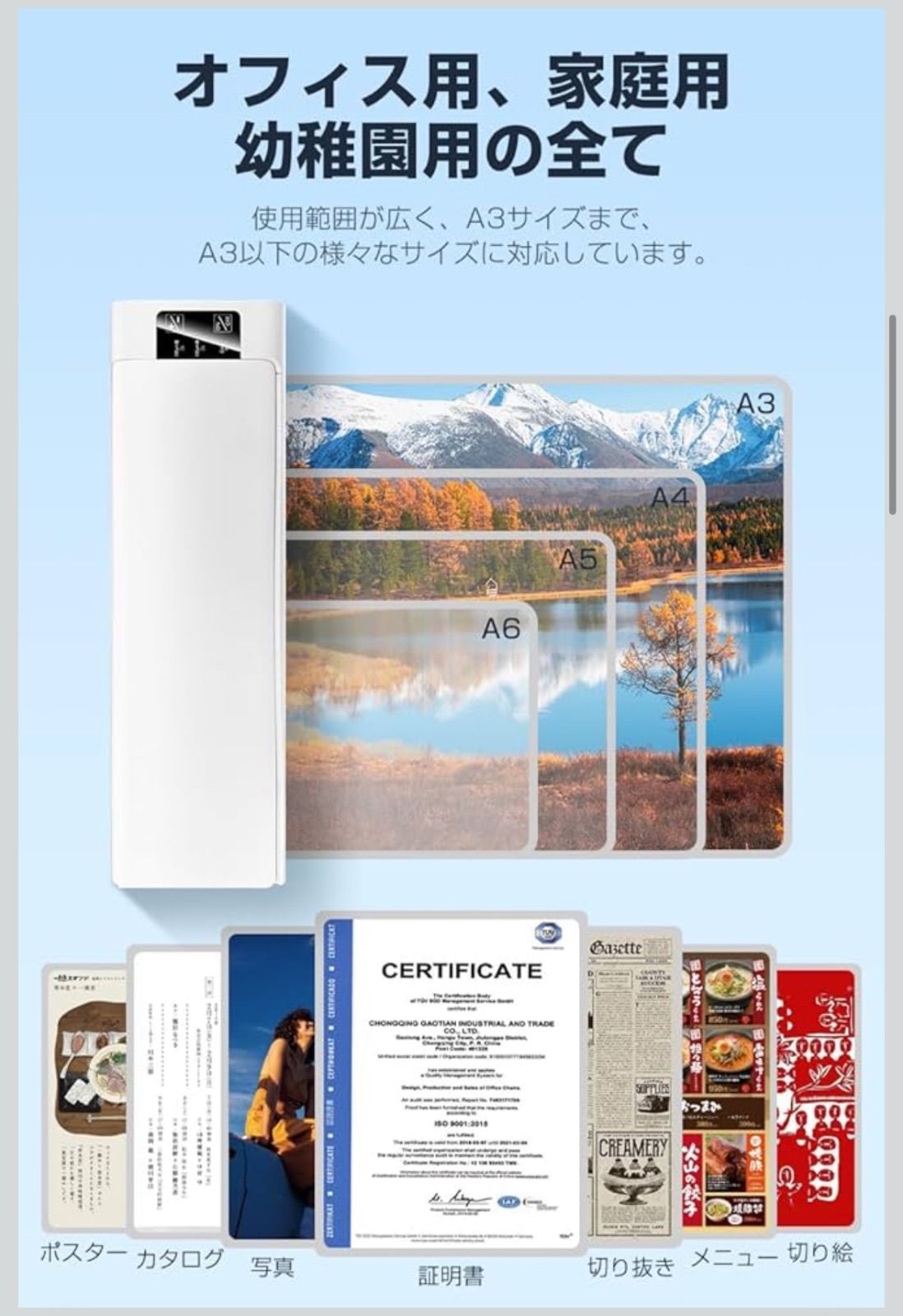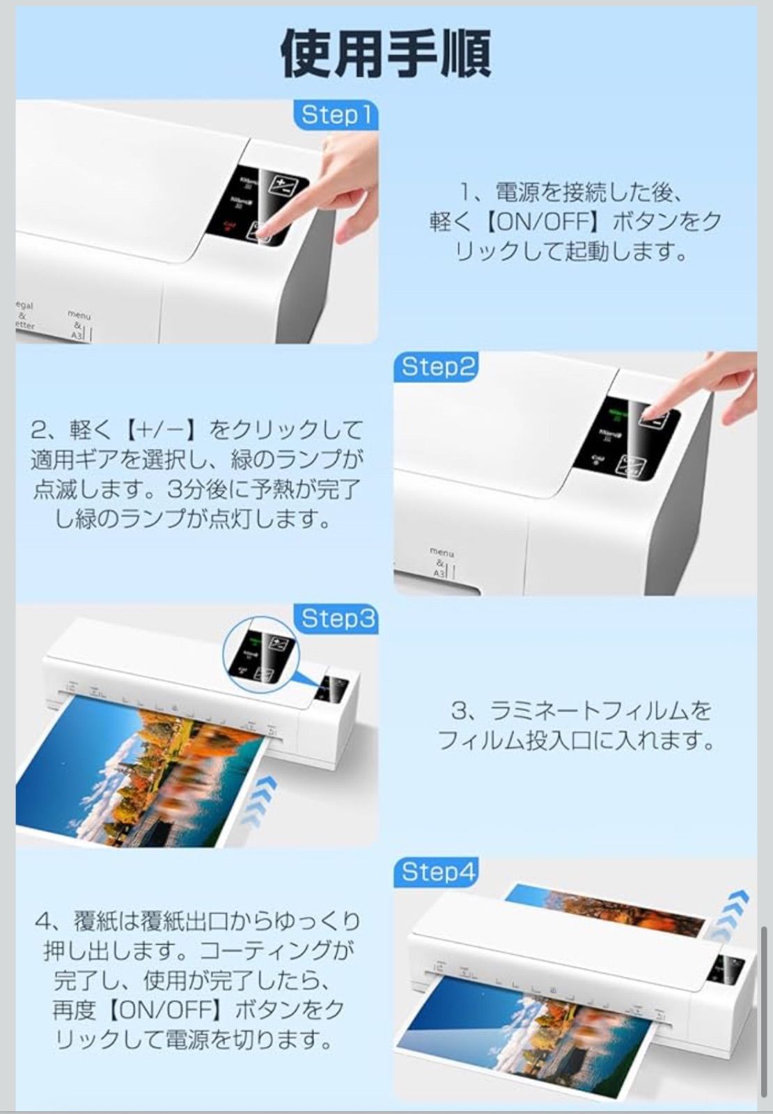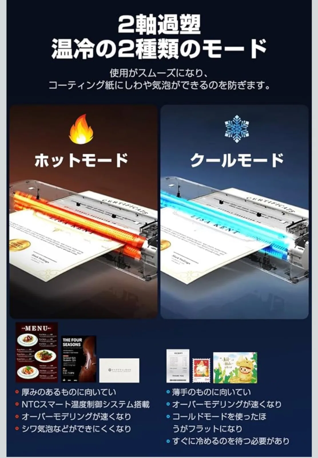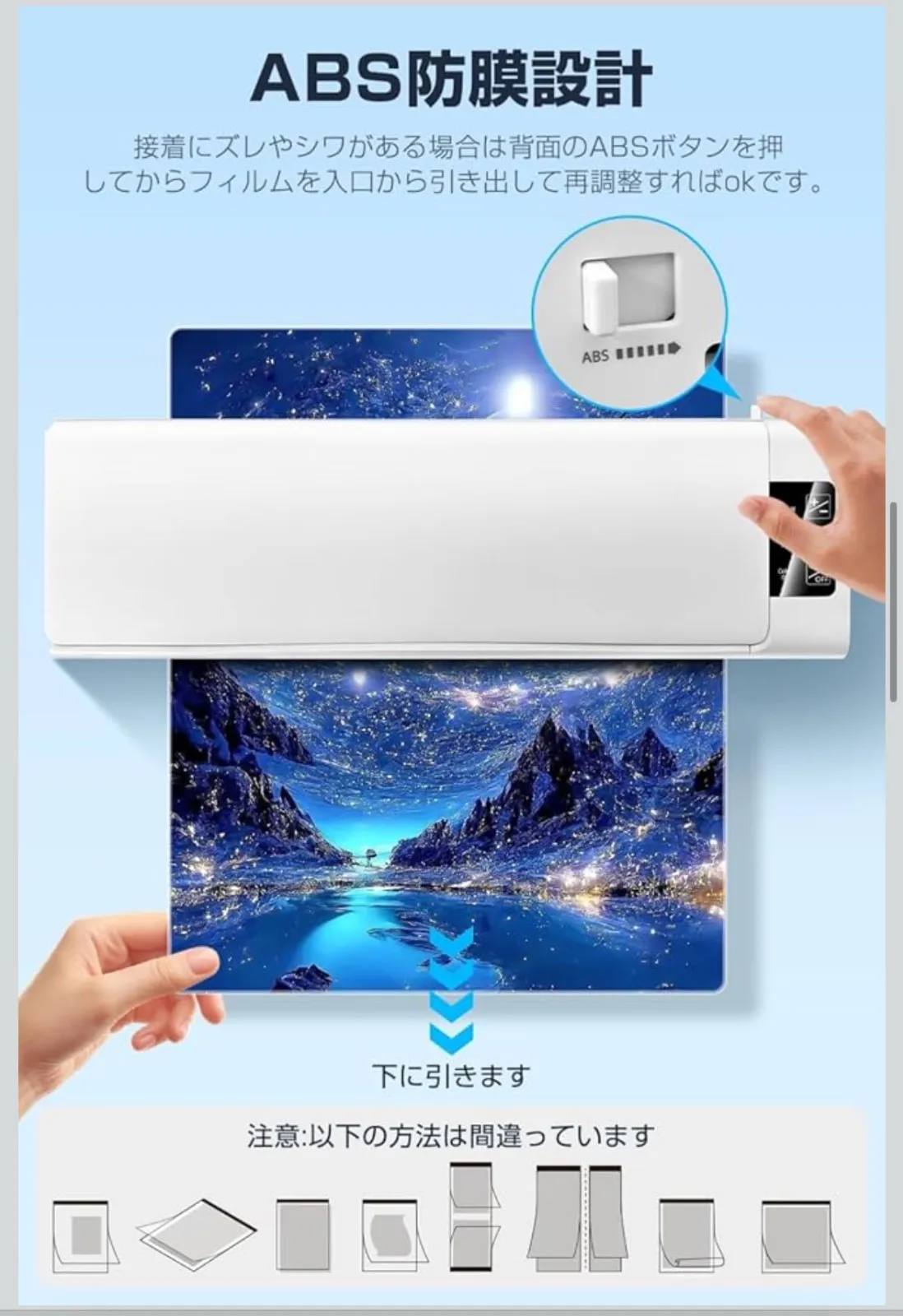 NCT智能温度制御が過熱やムラを防ぎ、素材を傷めません。45分自動オフでうっかり消し忘れも万全。お子様がいるご家庭でも、うっかり消し忘れても安心してお使いいただけます。最大の特徴はABS保護機能:紙詰まりや誤操作、急な停電時も、ボタン一つで安全に停止・書類取出しが可能。機械と書類をダブルで守ります。
