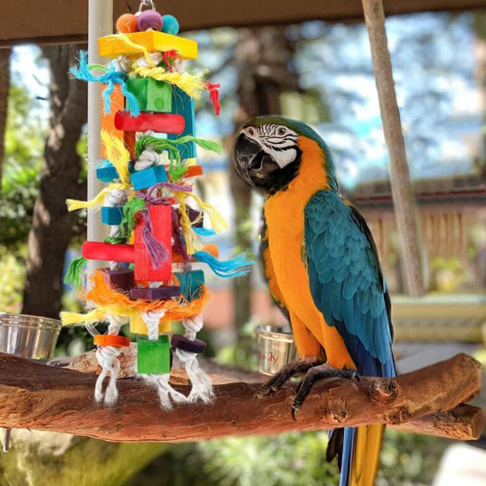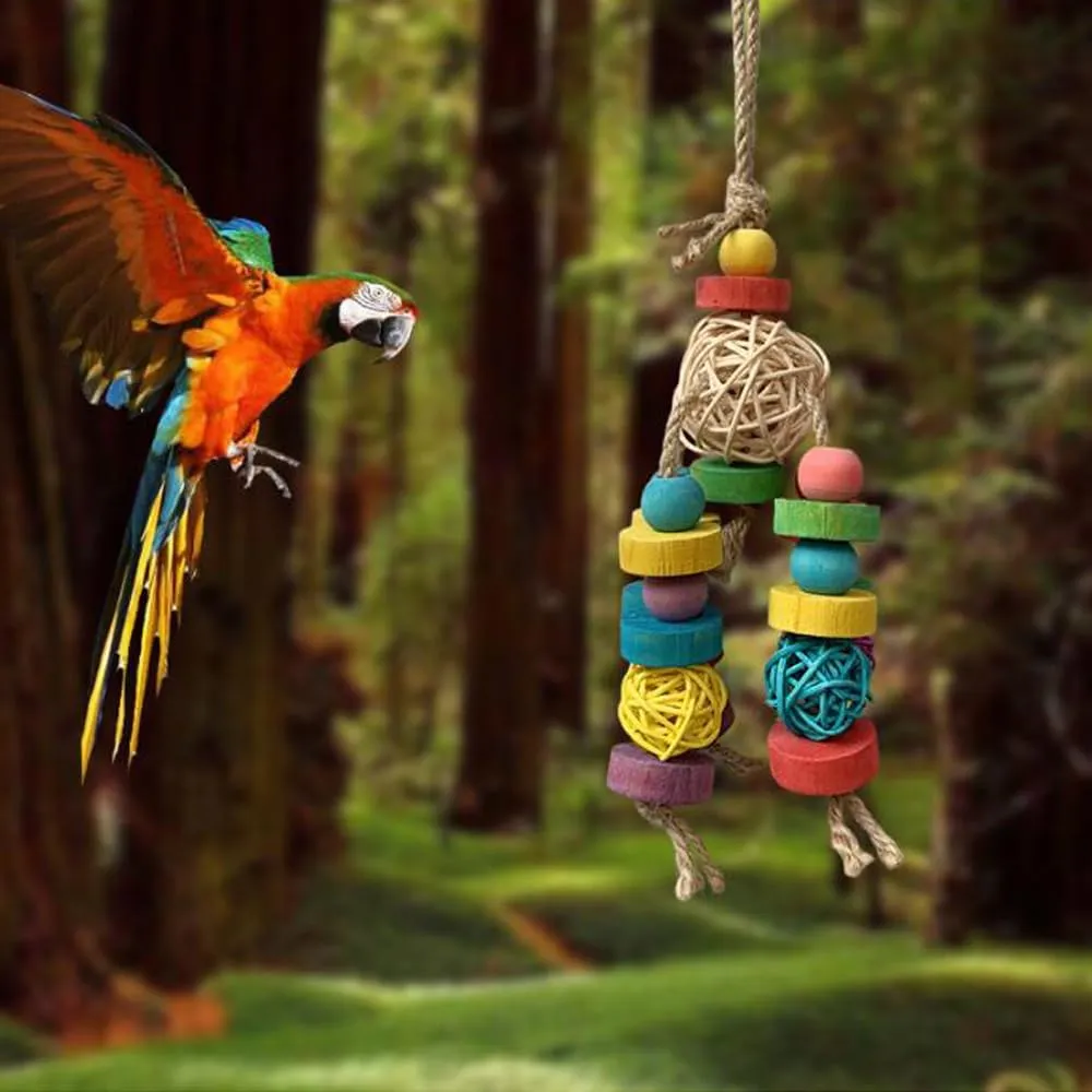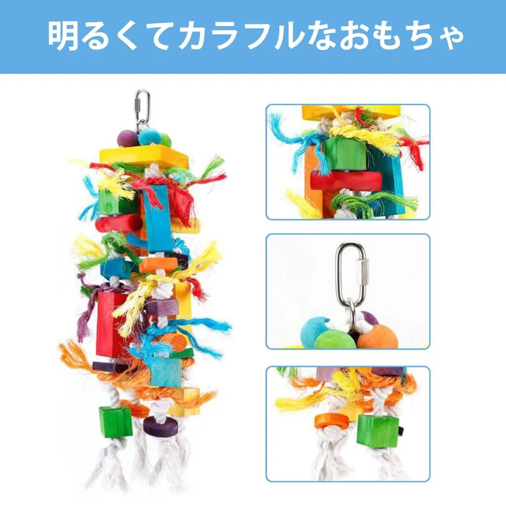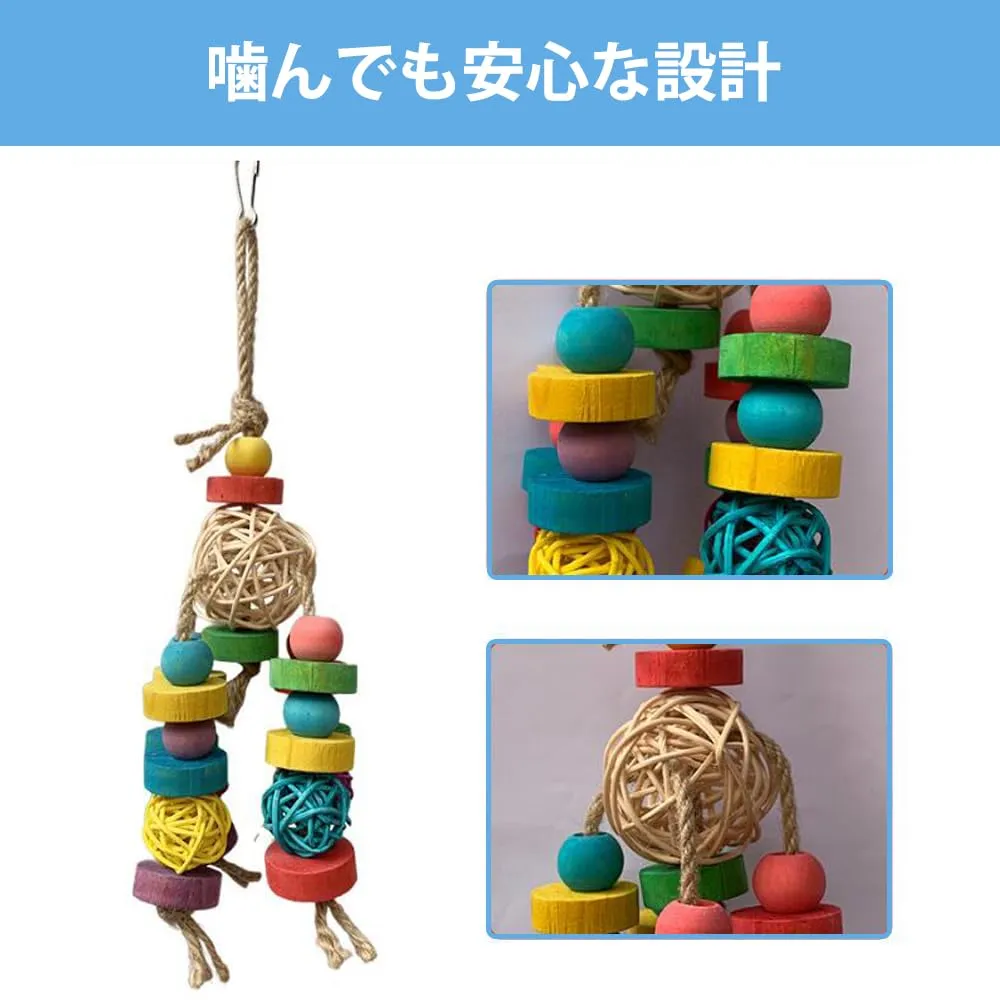 【素材】鳥用おもちゃの木製ブロックは、木材と綿ロープで作られており、100%天然素材で噛んでも安全です。