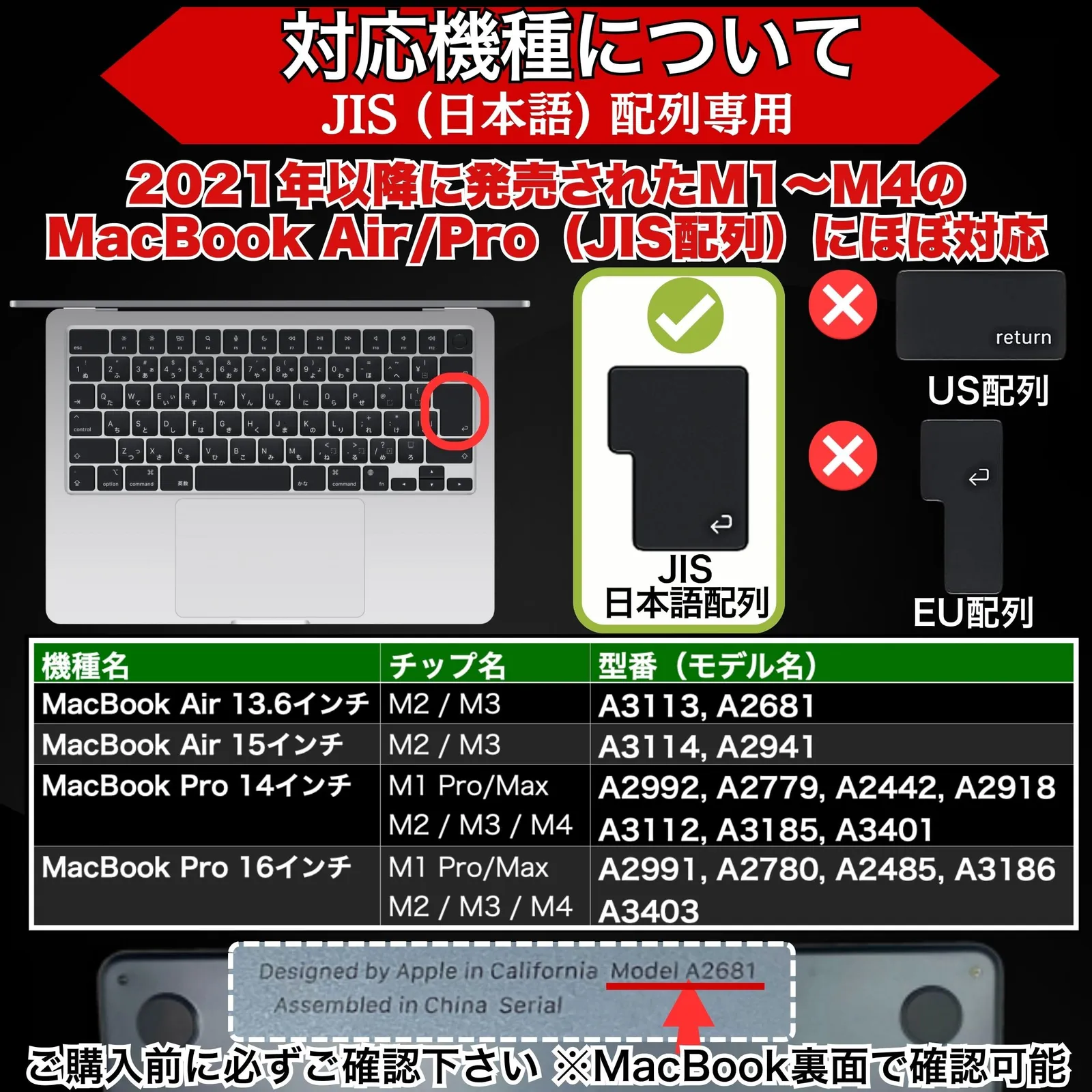 【対応モデル多数】MacBook Air 13.6 / 15インチ、Pro 14 / 16インチ(JIS配列)に対応。A3113 / A3114 / A2991 / A2992 / A2779 / A2780 / A2442 / A2485 / A2941 / A2681 / A2918 / A3112 / A3185 / A3186 / A3401 / A3403 など、最新のM1?M4チップ搭載(Appleシリコン)MacBook Air / Proに幅広く対応。お使いのモデルにぴったり合うカバーを選べます。