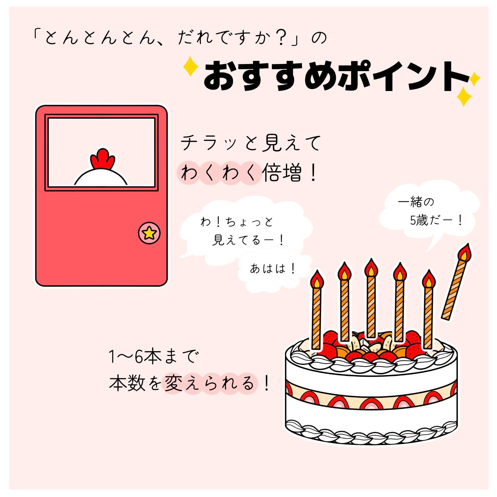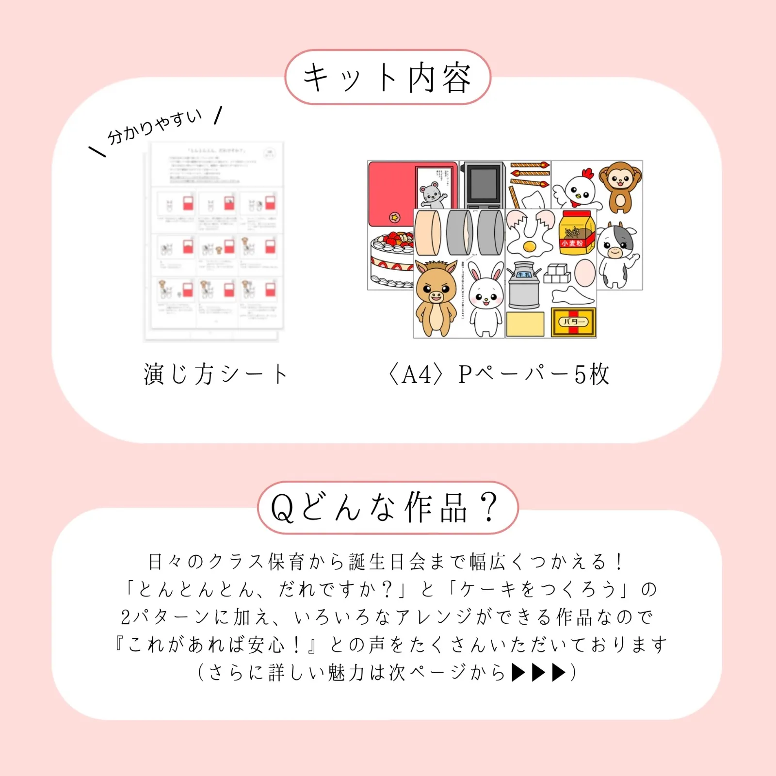 動物たちがドアからチラッと見えて登場する「とんとんとん、だれですか?」と、動物たちが持ってきたユニークな食材でケーキをつくる「ケーキをつくろう」の2つのおはなしセットです。組み合わせて見応えたっぷりなおはなしにもできるので、行事や誕生日会も安心です!