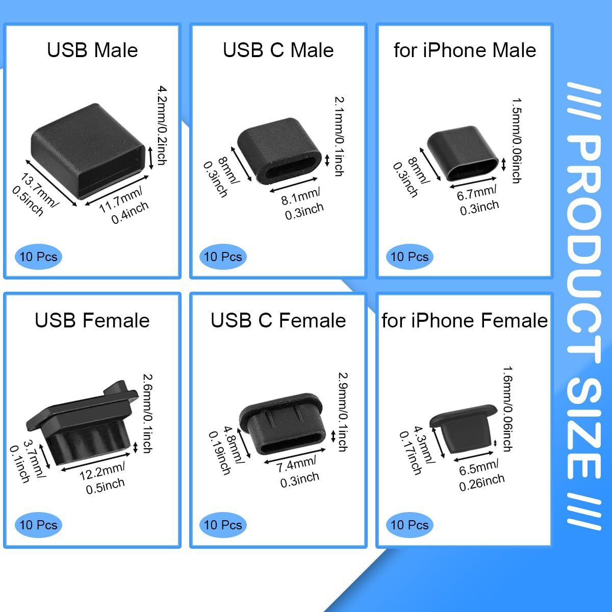 パッケージ内容: USB オス キャップ 10 個、USB メス キャップ 10 個、iPhone用 充電オス キャップ 10 個。 iPhone用 充電用メス キャップ 10 個、USB C オス キャップ 10 個、USB C メス キャップ 10 個。3 つの一般的な USB ダスト プラグは、さまざまな日常のニーズに対応します。10 個のクリーニング ブラシで、隙間のほこりを取り除くことができます。