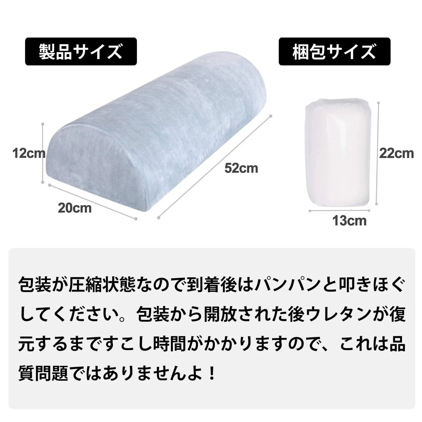 真空圧縮梱包:包装が圧縮状態なので到着後はパンパンと叩きほぐしてください、完全に膨らむまでは約1日-2日かかるおそれがあります。