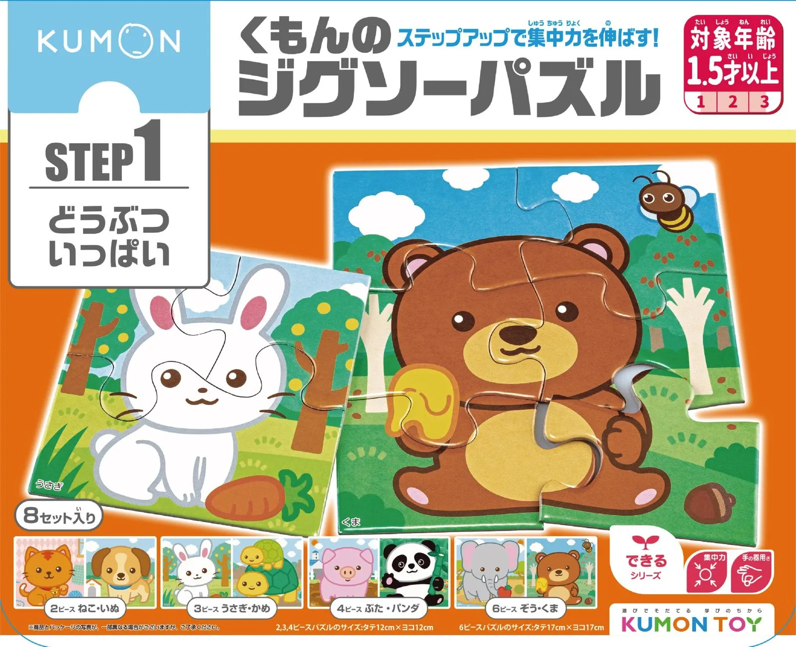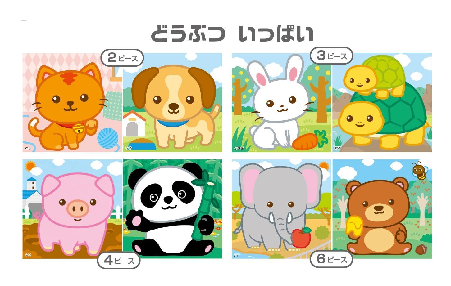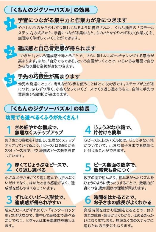 遊びながら学習につながる集中力と作業力を伸ばす「スモールステップ」方式のジグソーパズルです。ピースの少ないジグソーパズルから始めて、少しずつピース数を増やしていくことで、パズルを完成させる達成感を味わいながら、集中力と作業力を高めていけます。