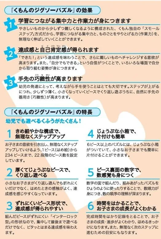 遊びながら学習につながる集中力と作業力を伸ばす「スモールステップ」方式のジグソーパズルです。