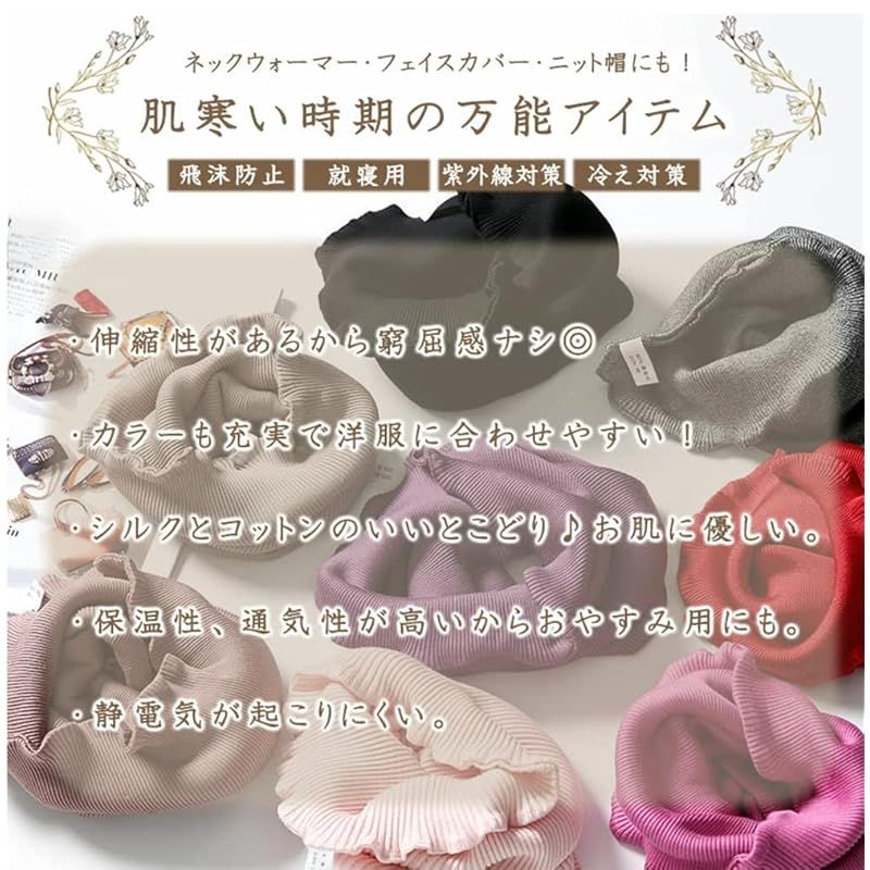 夏は涼しく冬は暖かい シルクネックウォーマーを選ぶ贅沢 天然のシルクは人のお肌に非常に近い 18種類のアミノ酸たんぱく質でできており お肌に優しい低刺激素材として知られています。 優れた保湿・吸湿・放湿・保温性があり、 夏は涼しく、冬は暖かに適度な湿度で素肌を包みます。