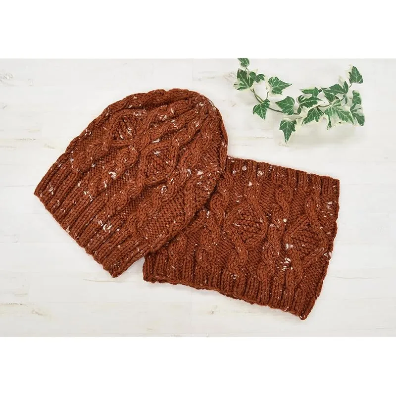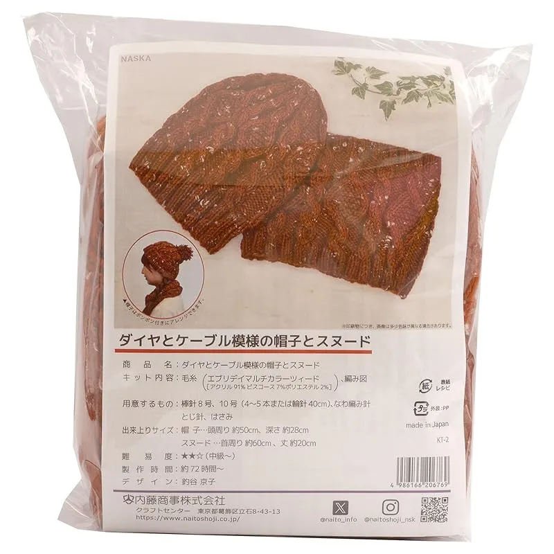 【新品】 NASKA あみものキット ダイヤとケーブル模様の帽子とスヌード (エブリデイマルチカラーツィード 使用) 赤茶色系 KT-2 デザイン 釣谷京子