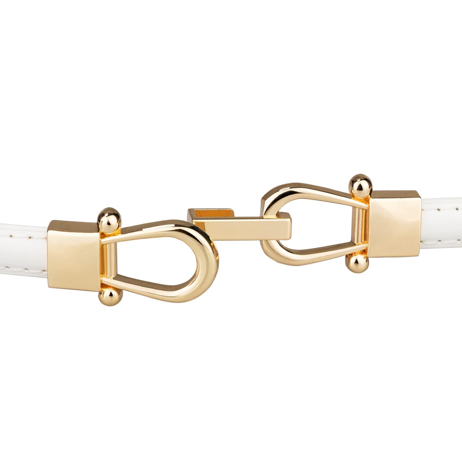 【デザイン】:細いレディースベルトなので、女性らしさを仕上げます。広げる時、金具部分を引っ張ります。締める時、左右の輪っかを動くかします。ゴールドカラーのの光沢のある高級感溢れるバックルを採用しています。価格もお手頃なので、女性らしい柔らかな印象に仕上げます。細身のデザインはがシンプルでかわいいです。飽きがこないから長く愛用できます。