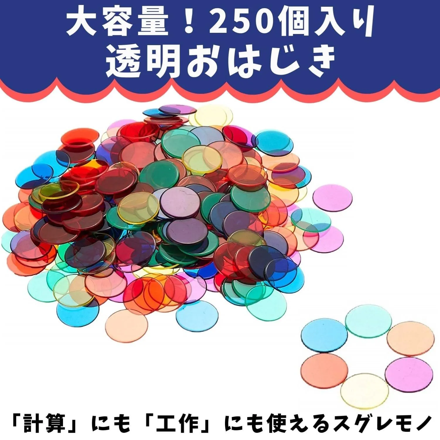 「Transparent Counters」は、薄さ1mmで軽いプラスチック製のおはじき250枚セット。カラフルでクリアなカラー!表面は平らでツルツル素材なので、いろんなものにくっつけやすく、使い道いろいろ!