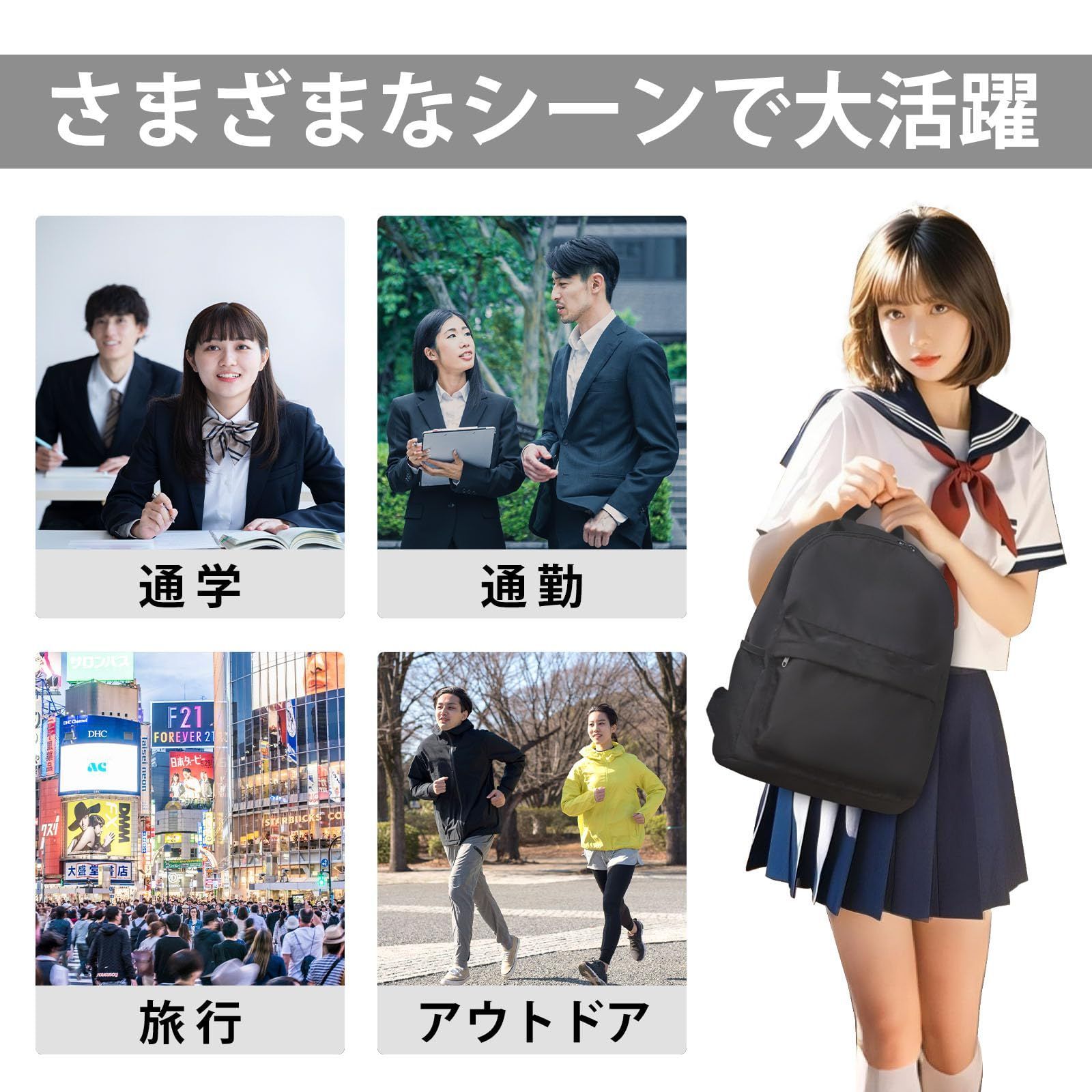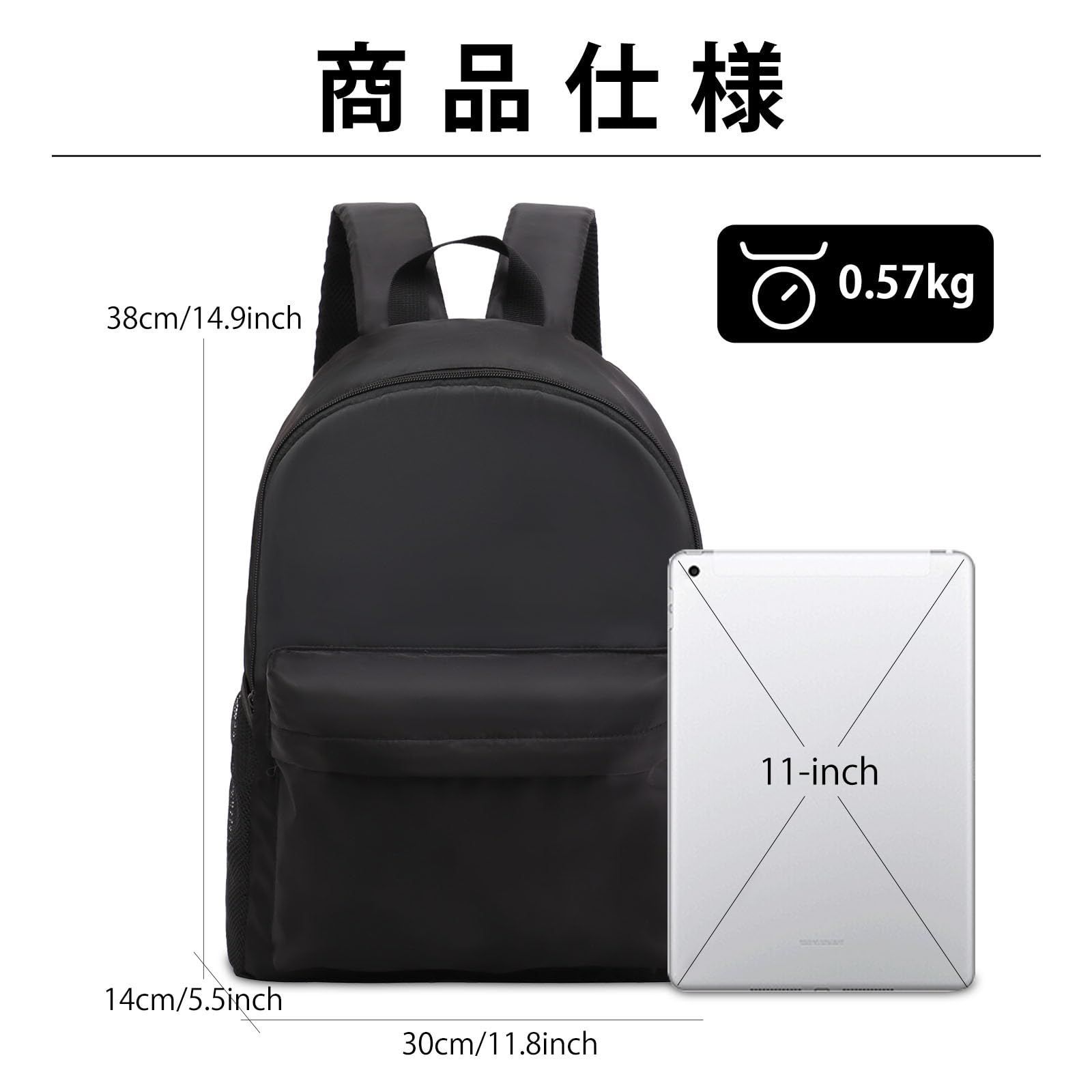 【大容量】リュックのサイズは30x14x38cm(11.81x 5.51x14.96インチ)です。重さはわずか0.5kgです。超軽量素材なので、長時間背負っても疲れません。多種類のポケットを搭載した大容量リュックサックです。会社員の方や高校生や大学生の学生さんまで、通勤通学用バックパックとして便利に活用できますのでおすすめです。