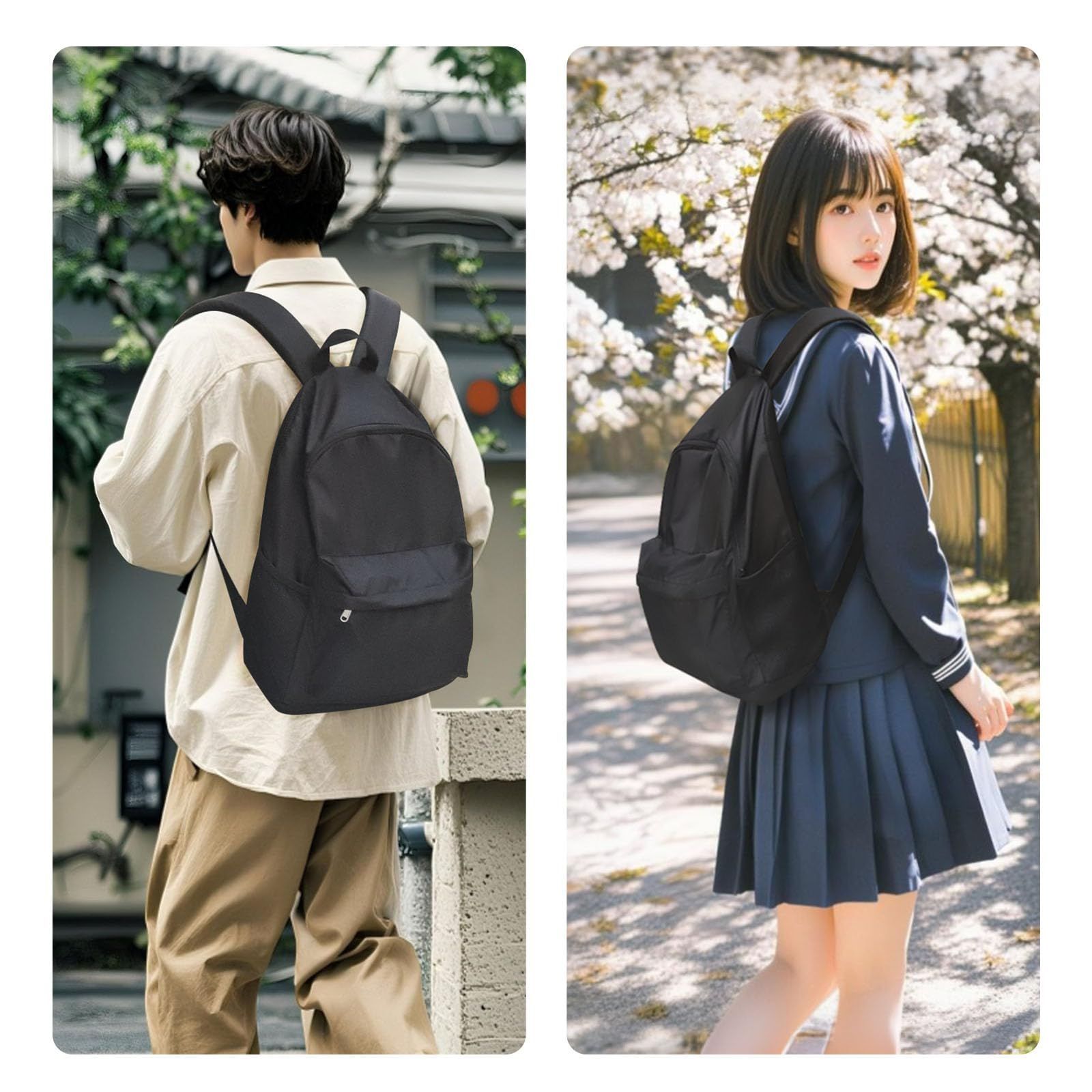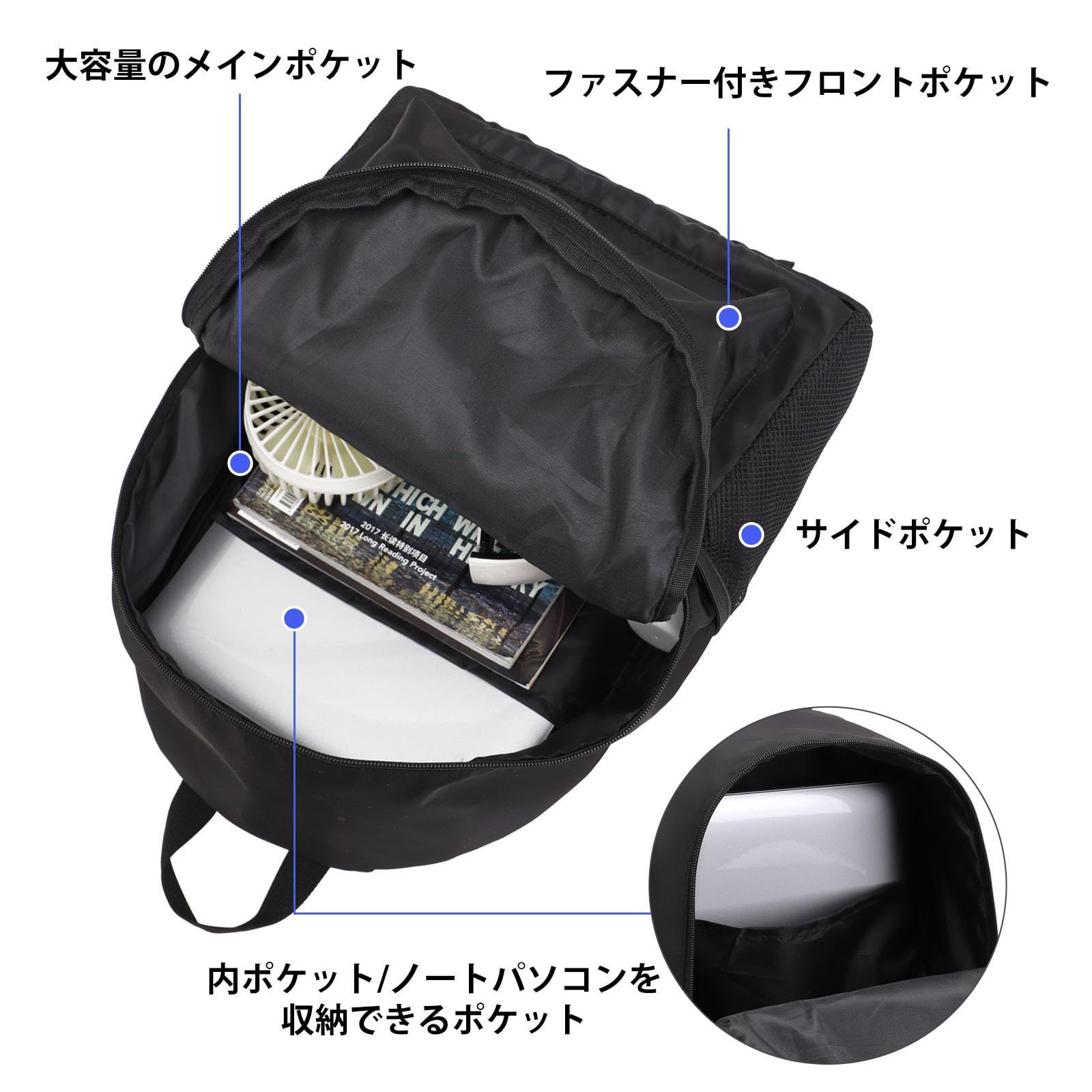 防水性に優れたポリエステルを採用、雨の日も安心の素材です。レディース、メンズ年齢を問わず使用できるシンプルなデザインと機能性が揃ったリュックです。独立したノートパソコン用ポケットはノートパソコンを簡単に収納できます。大容量のメインバッグには、本、昼食、軽装、学用品、旅行用品などの日常的な必需品を収納することができます。フロントファスナーポケットは鍵、ペン、鉛?を収納できます。2つのサイドポケットは水筒や傘を入れられます。すべてのアイテムをきちんと整理して簡単にアクセスできます。通勤、通学、旅行、遠足、登山、自転車、お出掛け、アウトドア、日常生活など普段使いに最適です。軽い1-2泊出張にも使えます。